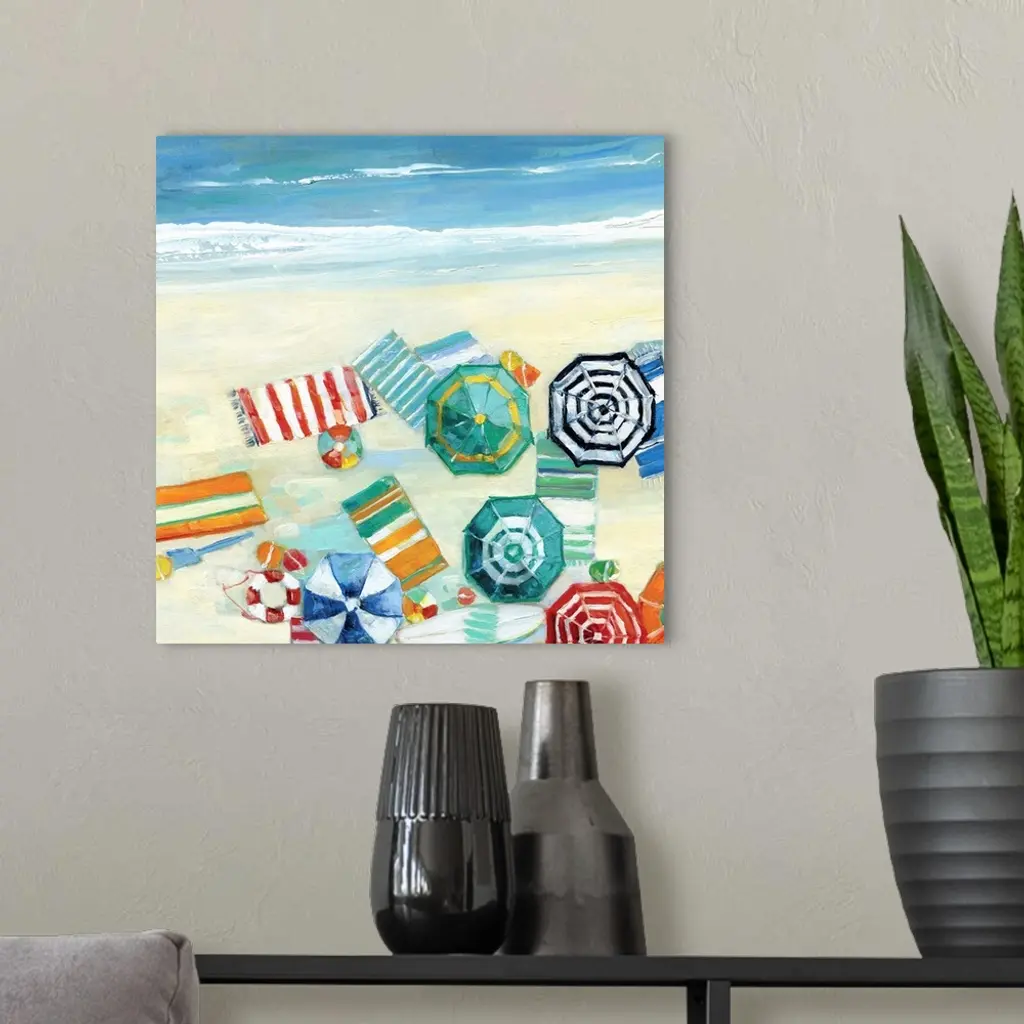 Contemporary painting of an aerial view of umbrellas, beach blankets, and other beach accessories.