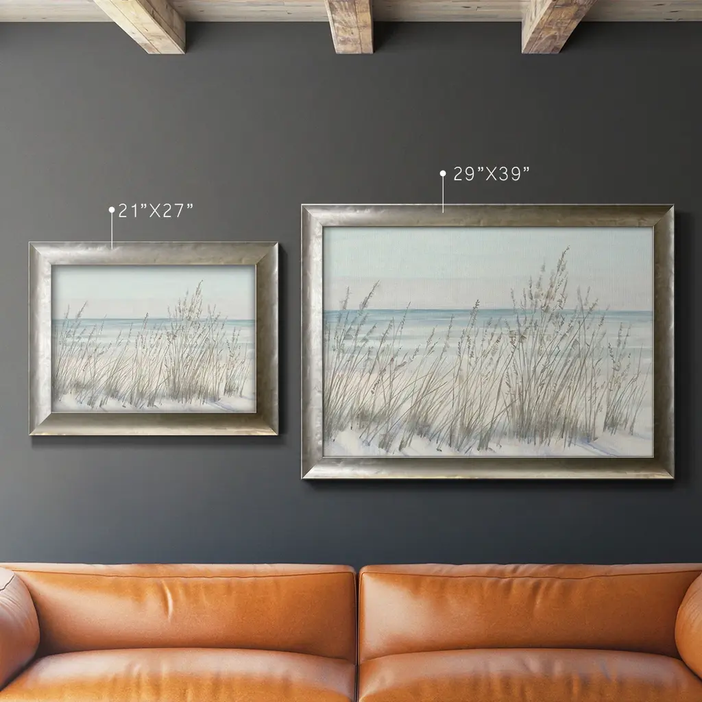 Beach Grass II Premium Framed Canvas- Ready to Hang A Premium Framed Canvas created to last. Framed in distressed wood and available in an array of sizes and colors Featuring a beveled a solid wood stretcher bar, each piece comes ready to hand 3 SIZES AVAILABLE 16''X20'' - Overall Size 18'X27'' - Overall Size 24''x36'' - Overall Size Each piece is made to order. Each piece comes with hanging hardware. Made in the USA Ready to Hang Giclee Paper Print Acrylic Glass Beveled Matt Board
