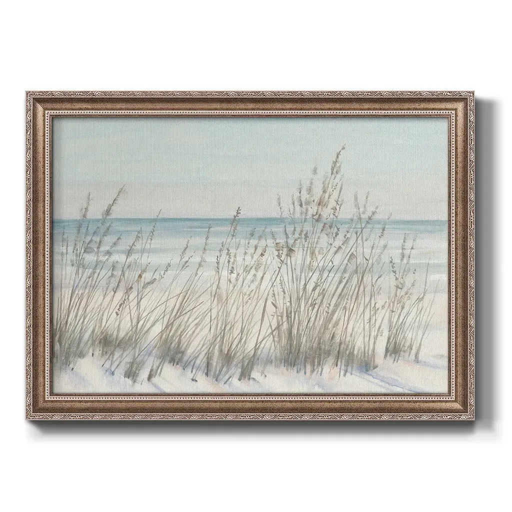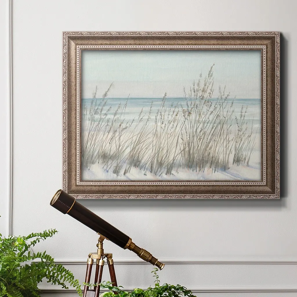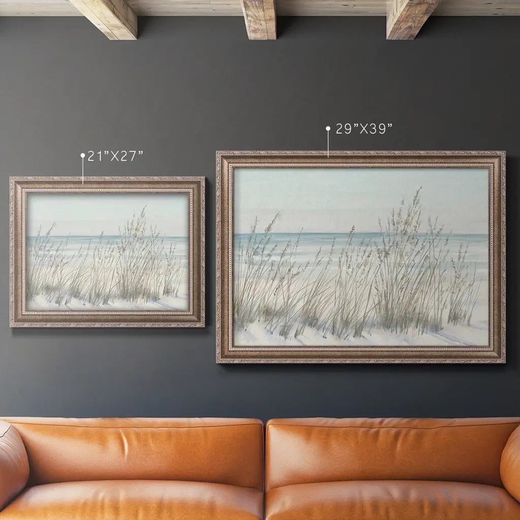 Beach Grass II Premium Framed Canvas- Ready to Hang A Premium Framed Canvas created to last. Framed in distressed wood and available in an array of sizes and colors Featuring a beveled a solid wood stretcher bar, each piece comes ready to hand 3 SIZES AVAILABLE 16''X20'' - Overall Size 18'X27'' - Overall Size 24''x36'' - Overall Size Each piece is made to order. Each piece comes with hanging hardware. Made in the USA Ready to Hang Giclee Paper Print Acrylic Glass Beveled Matt Board