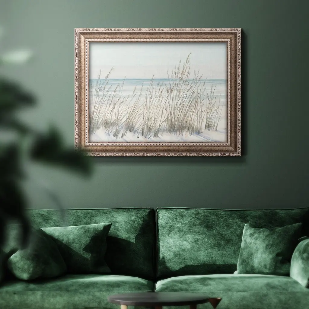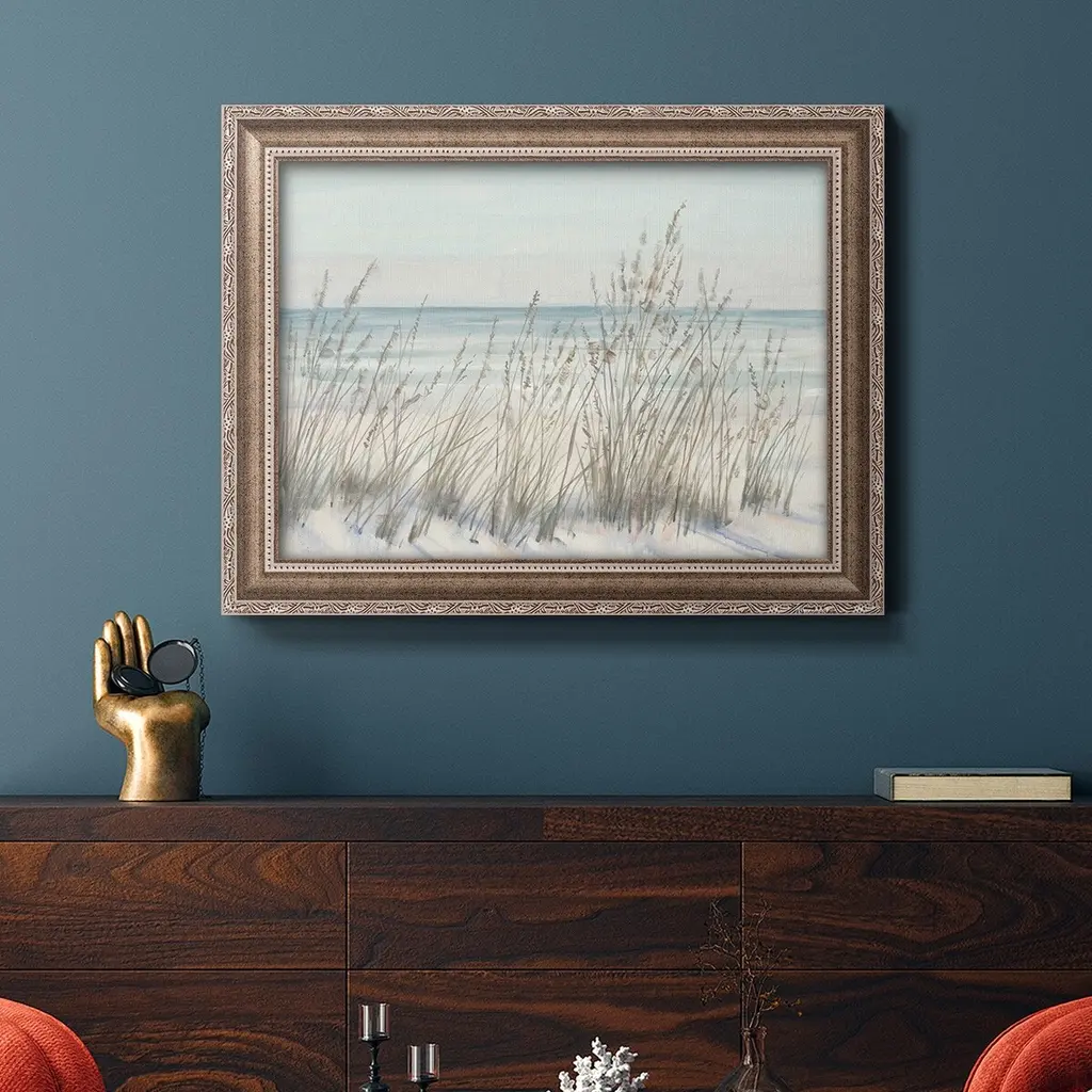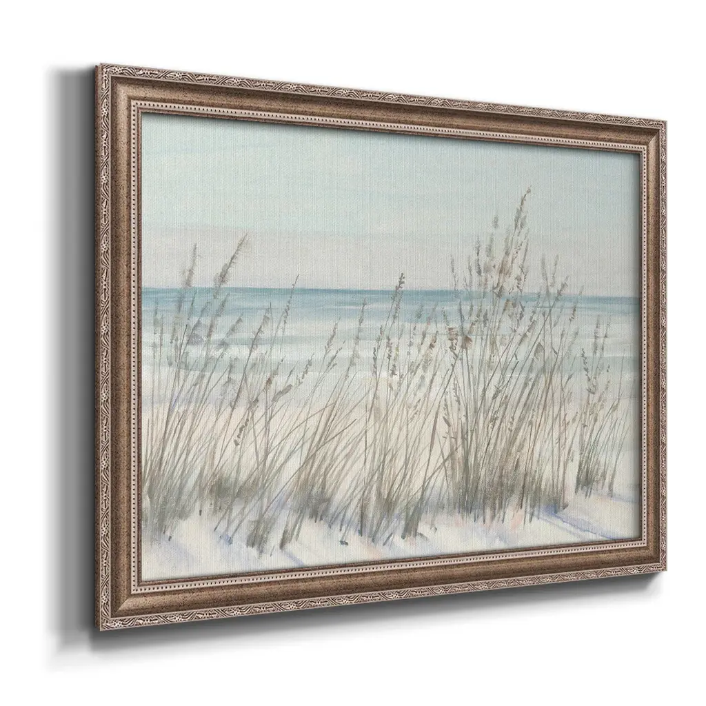 Beach Grass II Premium Framed Canvas- Ready to Hang A Premium Framed Canvas created to last. Framed in distressed wood and available in an array of sizes and colors Featuring a beveled a solid wood stretcher bar, each piece comes ready to hand 3 SIZES AVAILABLE 16''X20'' - Overall Size 18'X27'' - Overall Size 24''x36'' - Overall Size Each piece is made to order. Each piece comes with hanging hardware. Made in the USA Ready to Hang Giclee Paper Print Acrylic Glass Beveled Matt Board