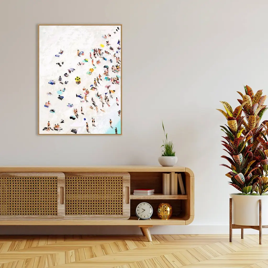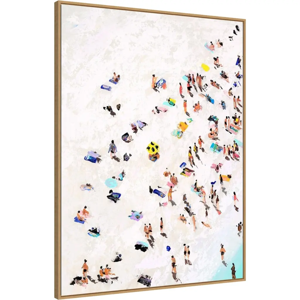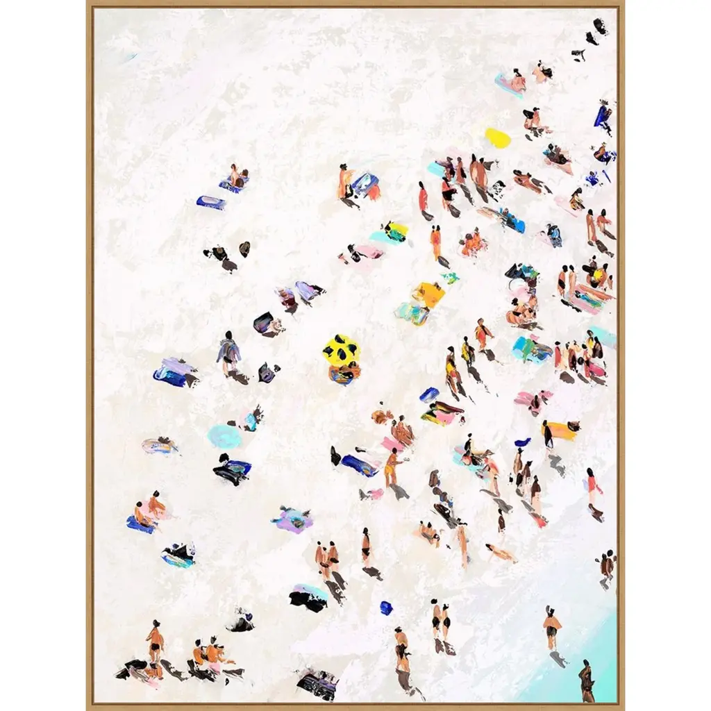 ART DESCRIPTION: On a sunny summer day, beachcombers flock to sandy shores, spreading their towels and getting ready to wade into the turquoise waters. These abstract figures cast deep shadows that contrast their colorful beachwear. This Amanti Art canvas art print was created by Urban Road and printed by Amanti Art in Madison WI. The canvas is stretched by hand and finished with a float frame. Individually made using traditional custom framing techniques, it has the quality you would expect from your local frame shop. Features: CUSTOM CANVAS ARTWORK DETAILS: Beach Life by Urban Road. ART DESCRIPTION: On a sunny summer day, beachcombers flock to sandy shores, spreading their towels and getting ready to wade into the turquoise waters. These abstract figures cast deep shadows that contrast their colorful beachwear. FRAME DETAILS: The canvas is framed in the Sylvie Maple frame, which is a modern, float frame with natural maple woodgrain coloring and dramatic depth. The frame measures 1 in. wide and stands 2 in. off the wall. The canvas appears as if it is floating in the frame because it has a narrow gap between the edge of the canvas and the frame. The overall size of this framed canvas print measures 32 in. W x 42 in. H. QUALITY AND AUTHENTICITY: Canvas is printed with high-quality, fade-resistant inks for picture-perfect detail and incredible depth of color. Canvas is stretched across a solid surface to resist sagging. We use only premium, high-tension canvas. Our exclusive stretching techniques hide corner folds and provide a taut canvas surface. The artwork is authentically licensed. HASSLE-FREE HANGING: Ready to hang for easy installation. ASSEMBLED IN THE USA: Each piece is assembled to order in Madison, WI USA. FOR HOME OR COMMERCIAL USE: Because of our attention to detail and focus on artistry, architects, interior designers, and homeowners alike choose this framed canvas artwork to create beautiful living spaces.