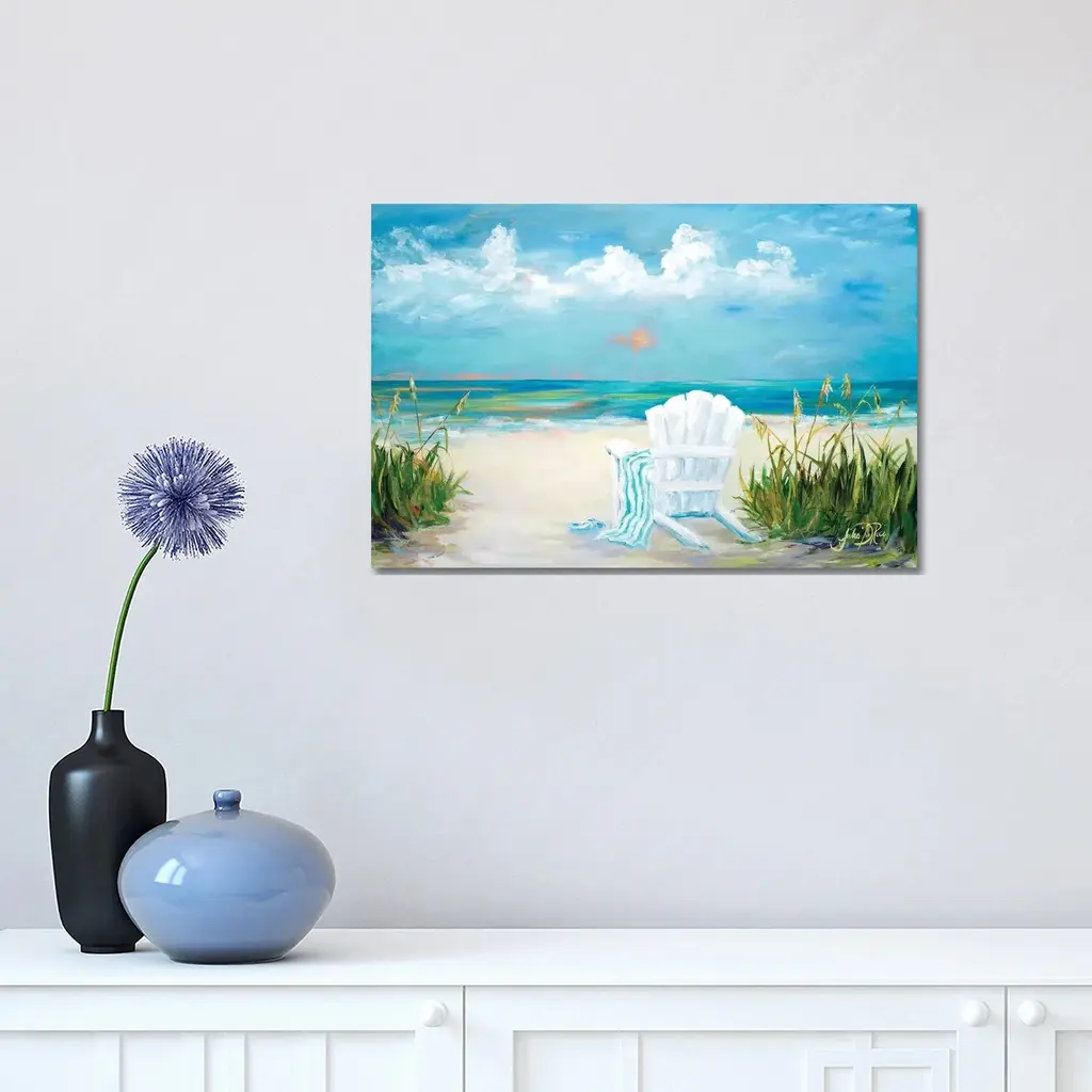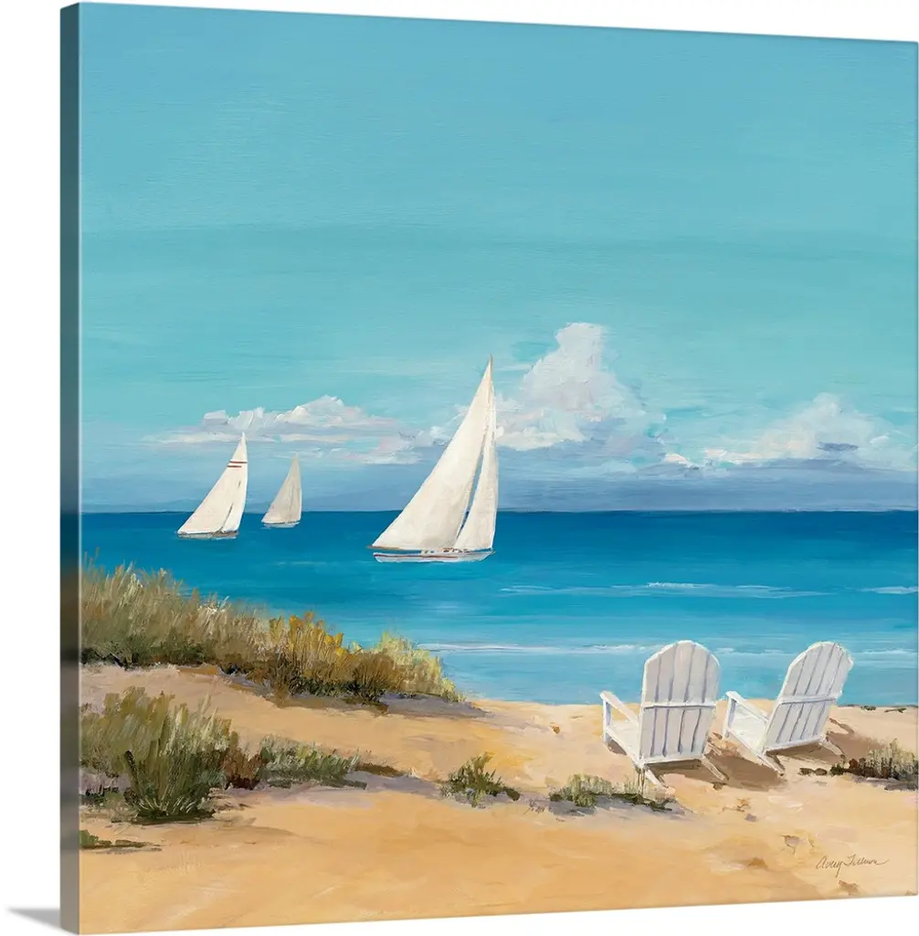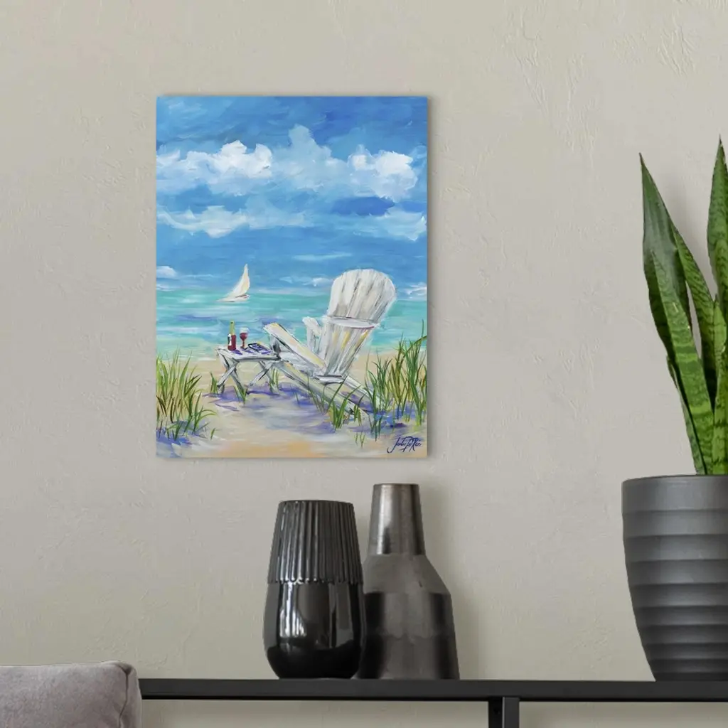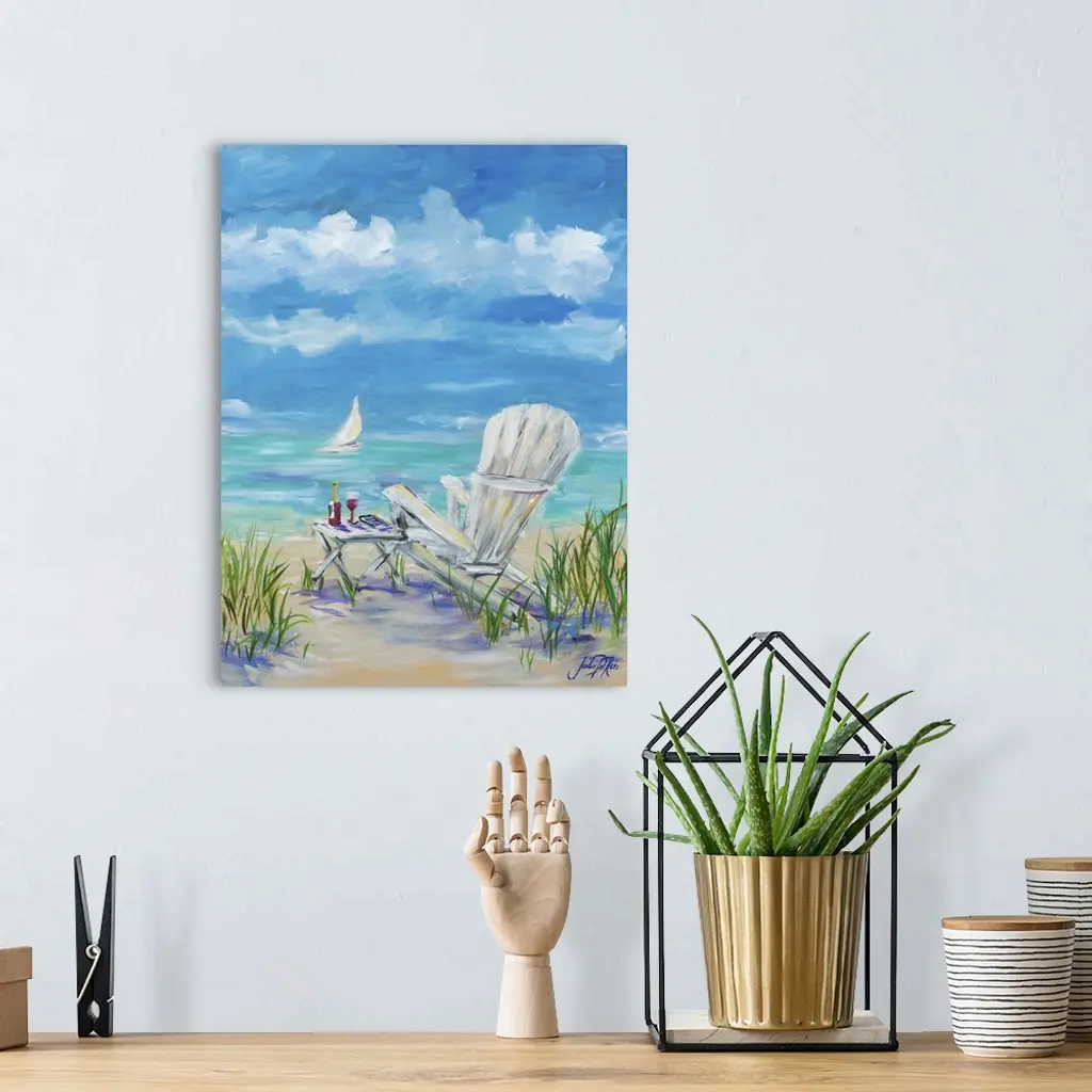 Contemporary painting of a relaxing beach scene with a white beach chair and a table with red wine and a sailboat in the distance.