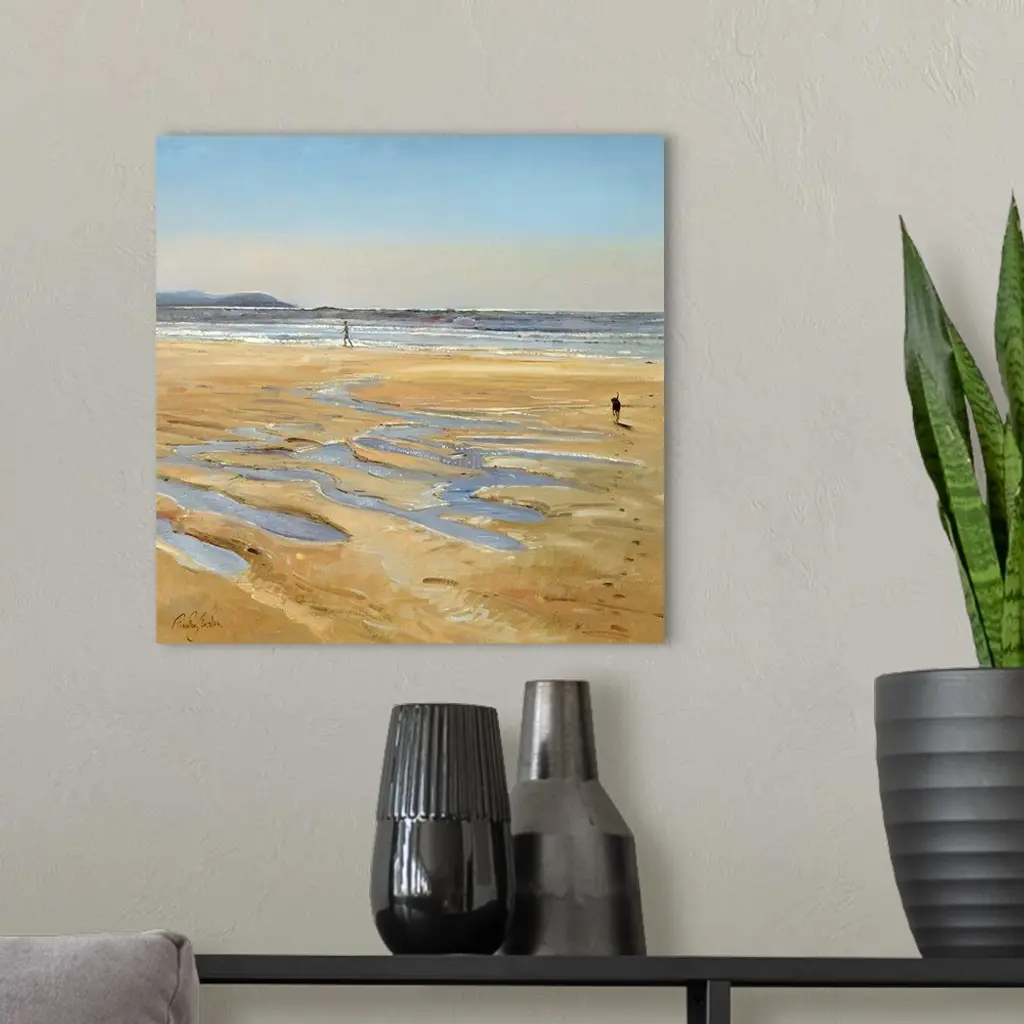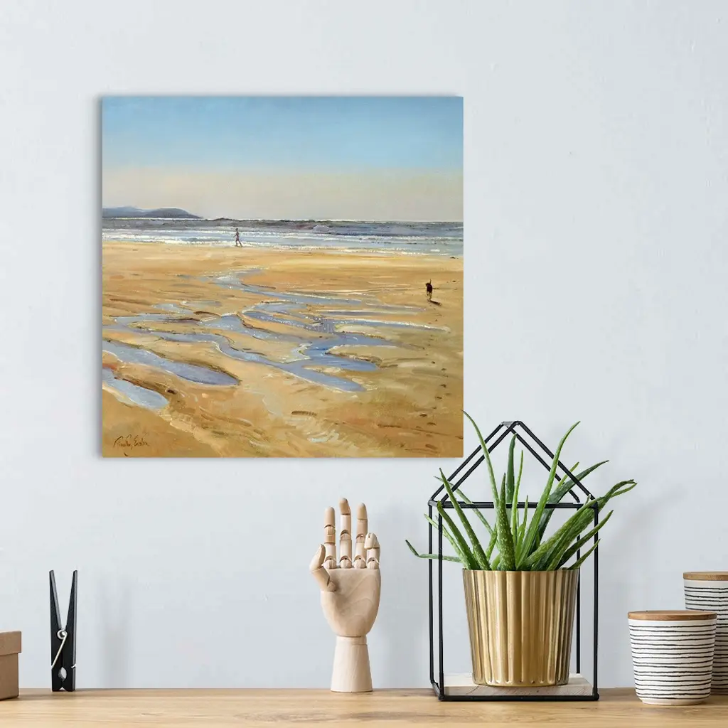 Contemporary artwork of a person walking along the water on the beach as their dog runs toward them. Puddles of water lay in the sand in the foreground.
