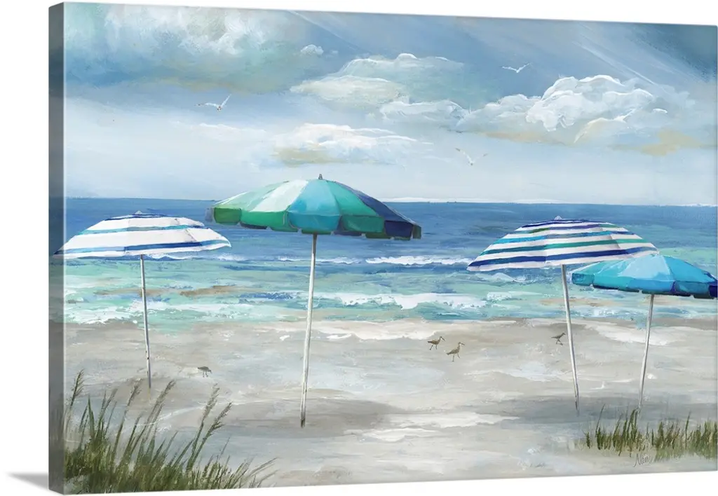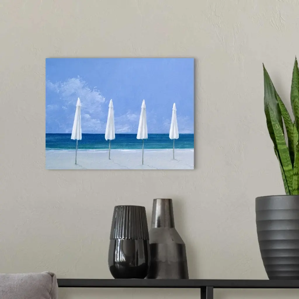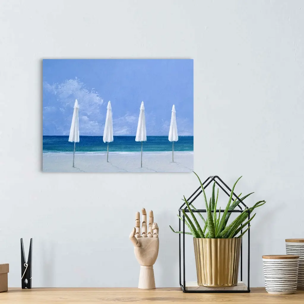This wall art is a contemporary and photorealistic painting of four closed umbrellas in a row on a sandy beach looking out to sea.