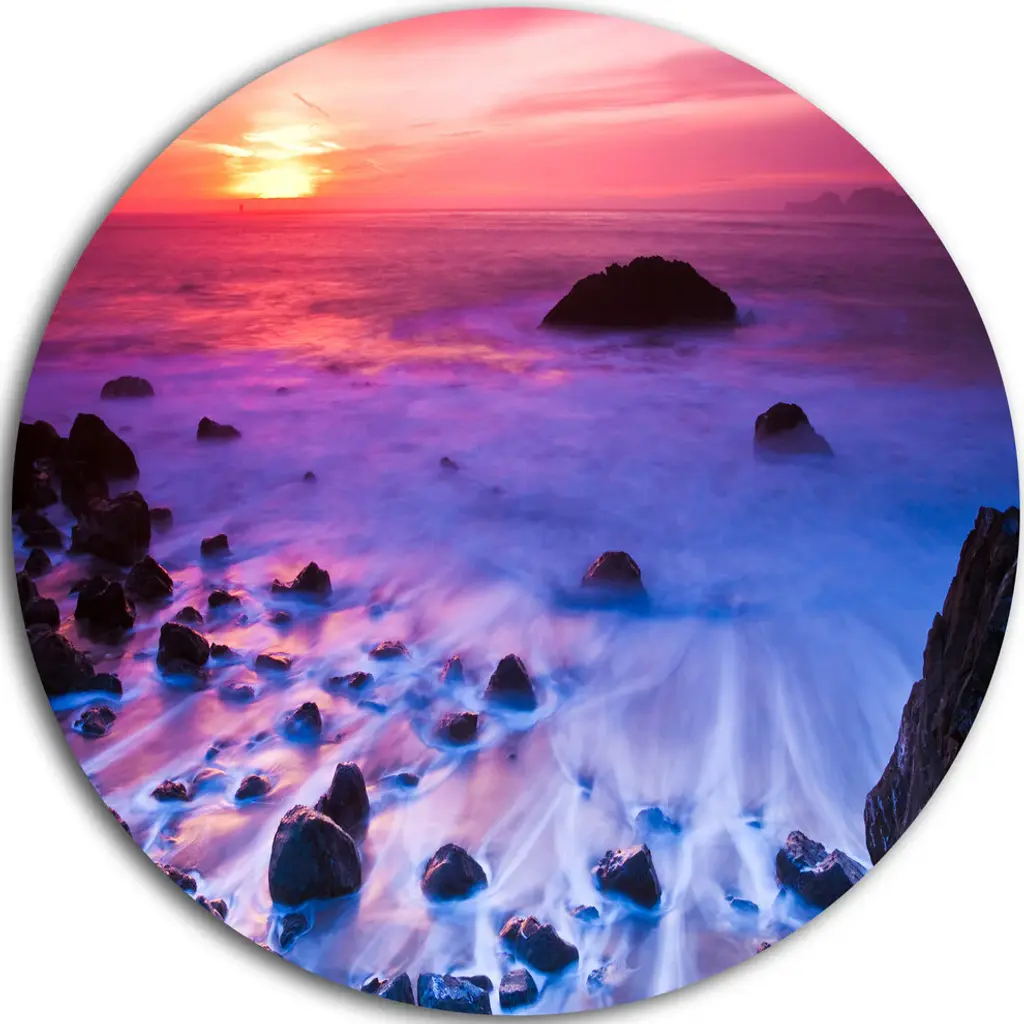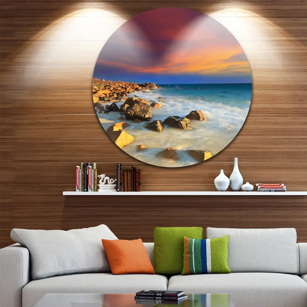 Bring Contemporary Abstraction to your home with this large Circle Metal wall art. This Beach with Stones on Foreground Metal Artwork makes it the focal point of any room or office. - White Gloss Coating ensures colors are extra vibrant with light reflection.- Aluminum grade Sheet Metal with 1 inch mounting frame on the back giving the illusion that the artwork is floating on the wall..- Mounting Brackets are included along with instructions.- High Quality Digital images are created directly into a glossy aluminum panel producing a stunning and captivating print into the glossy finish of the metal.- Water, Fire and Scratch resistant HD Aluminum panels.- Looks better than any photo paper and guaranteed to last at least 20 years- Easy to clean with a microfiber cloth. Colors are far superior to regular Canvas Art. - Easy to Hang