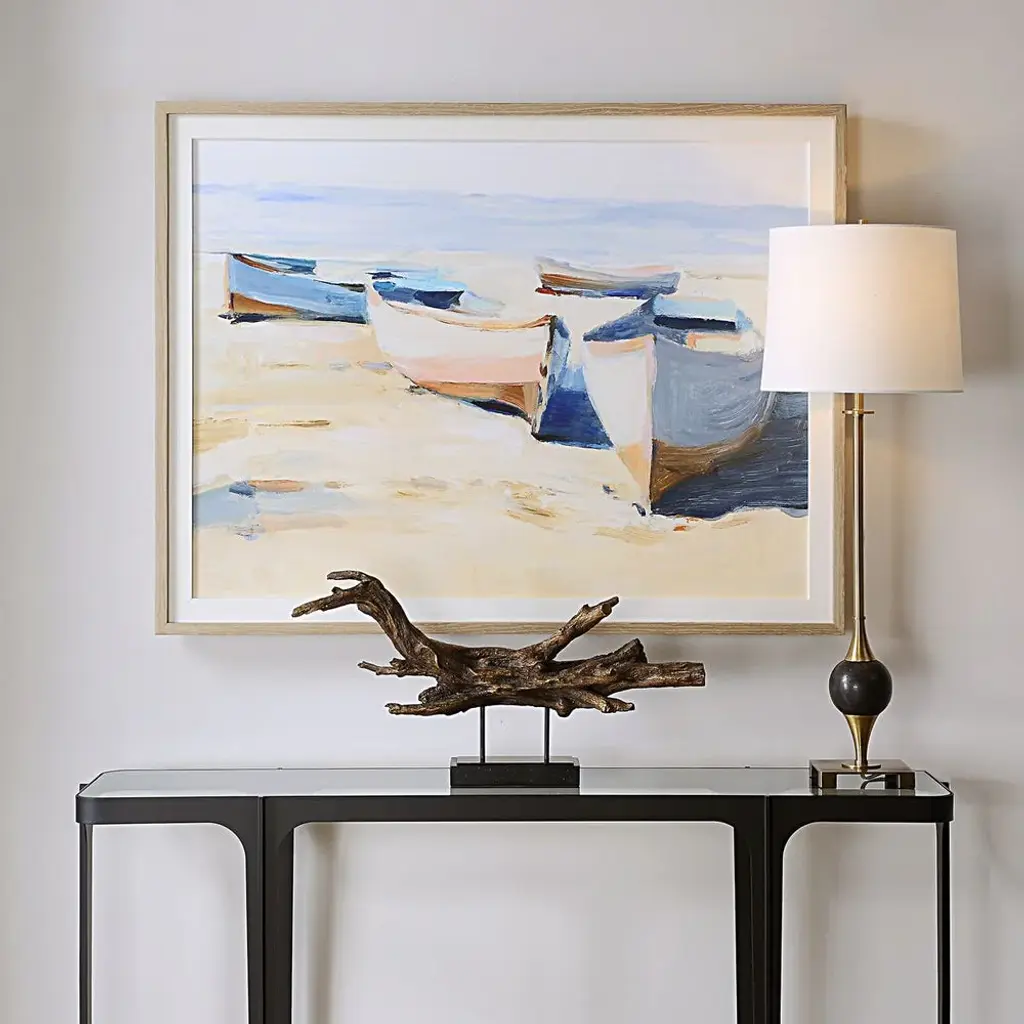This small-scaled brass table lamp features a complementary brass shade. Its' pillowy profile and subtle antiquing provides visual dimension.