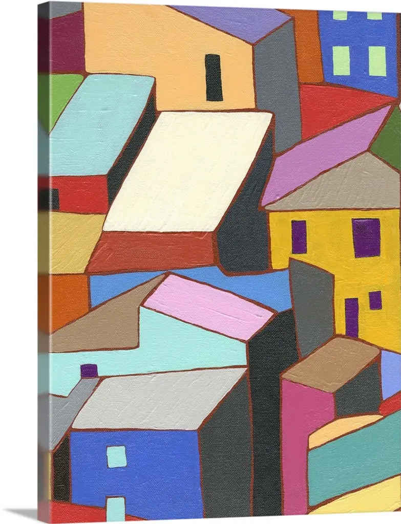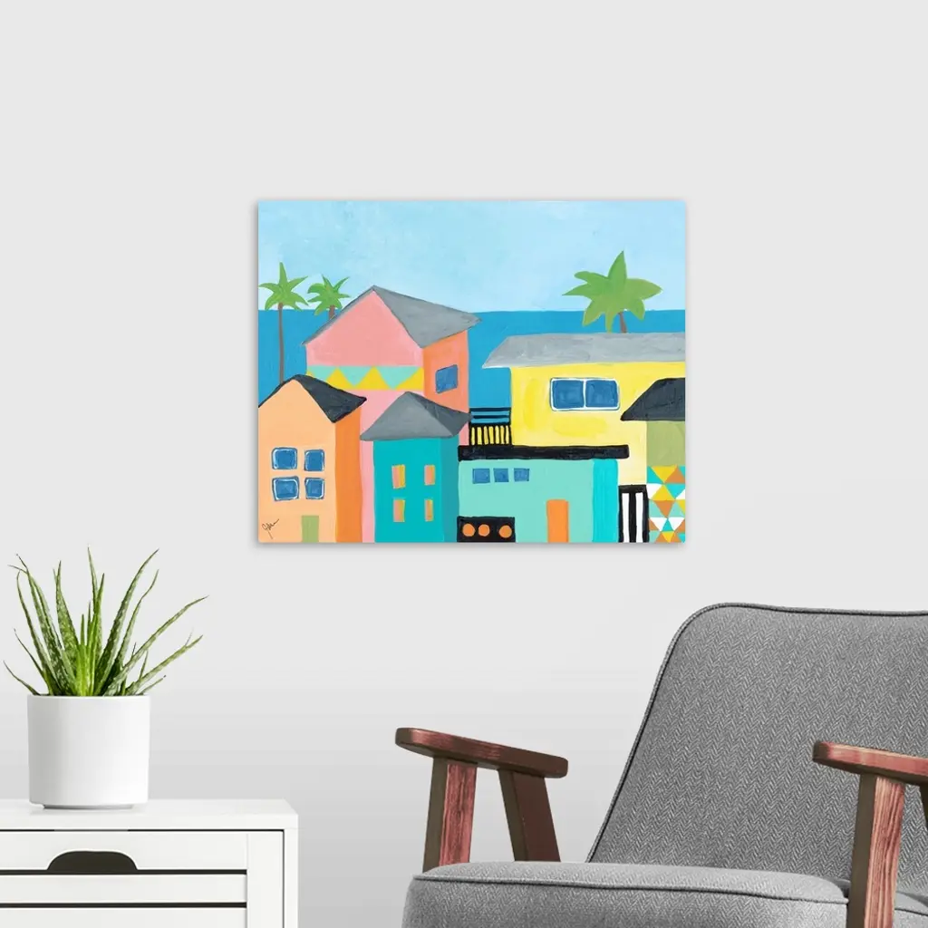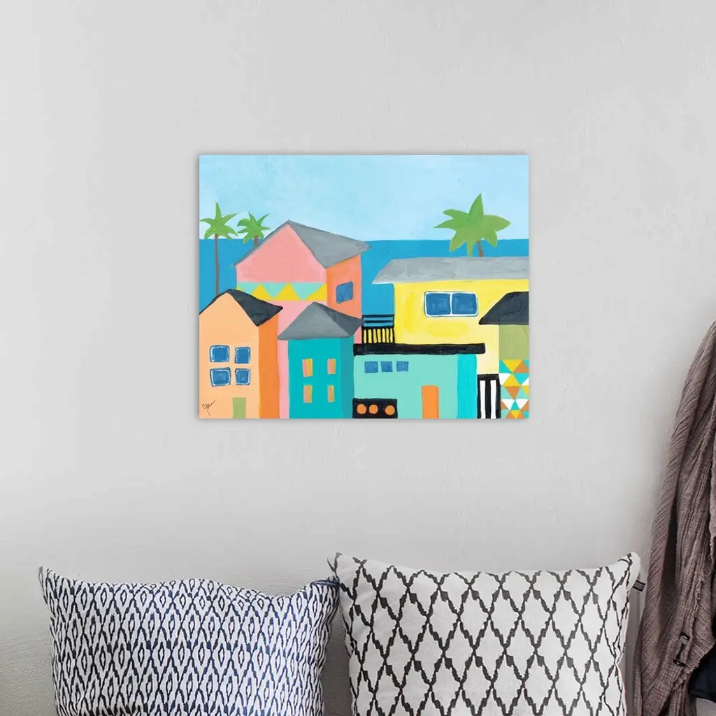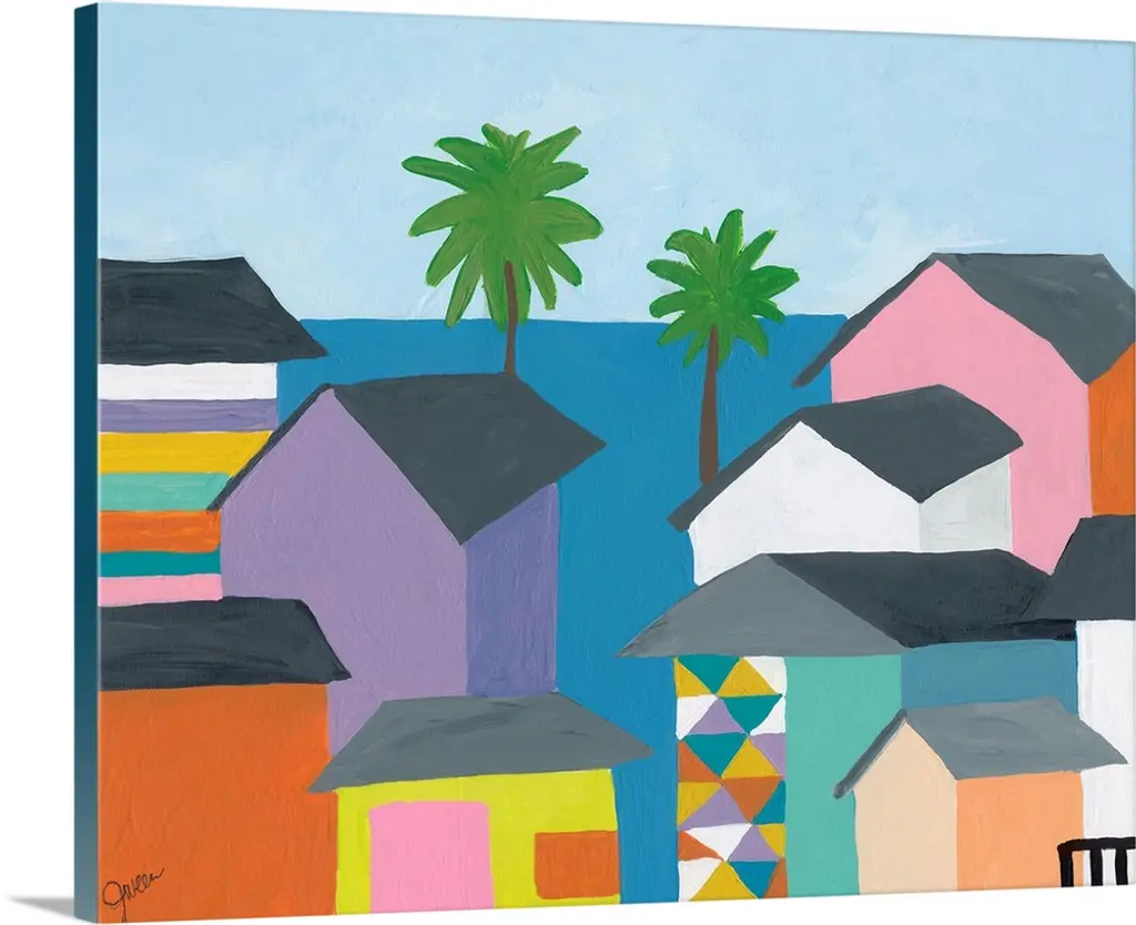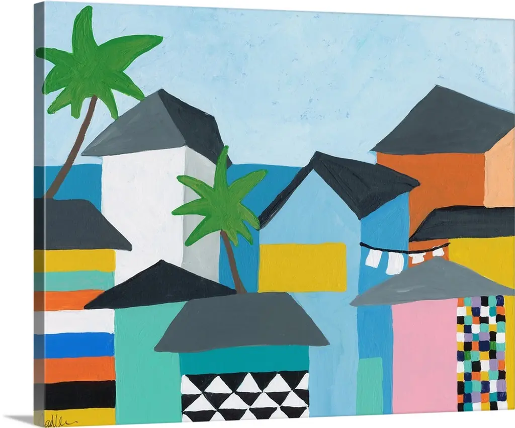 Contemporary painting featuring several colorful houses on the coast, with the ocean and palm trees.