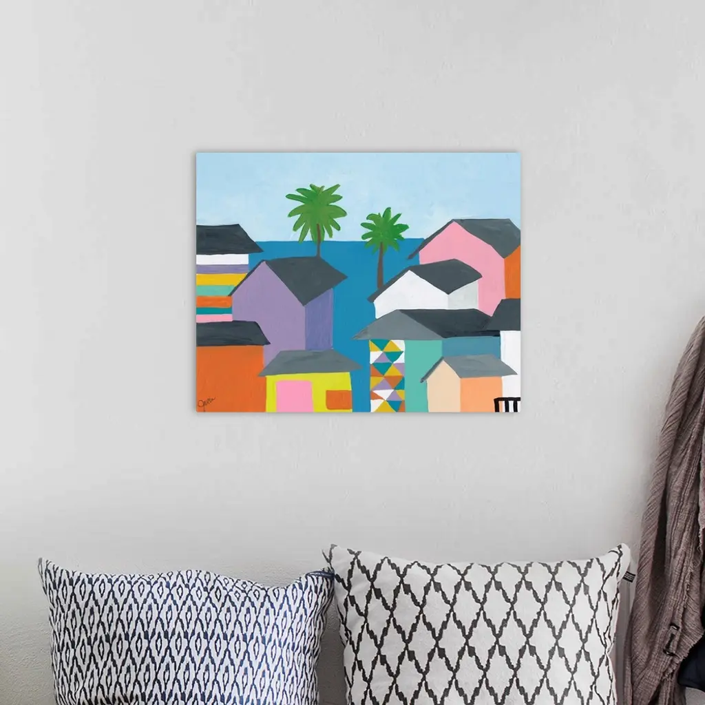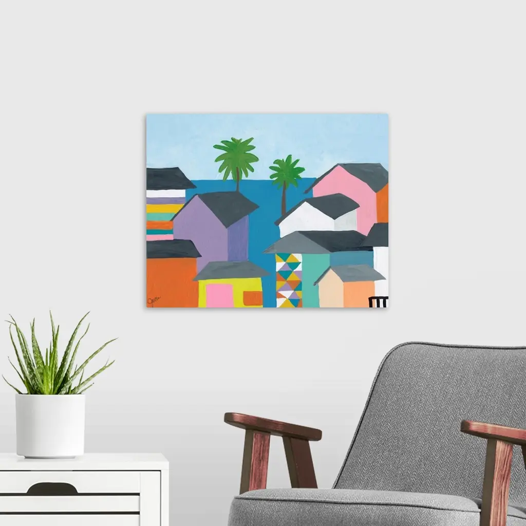 Contemporary painting featuring several colorful houses on the coast, with the ocean and palm trees.
