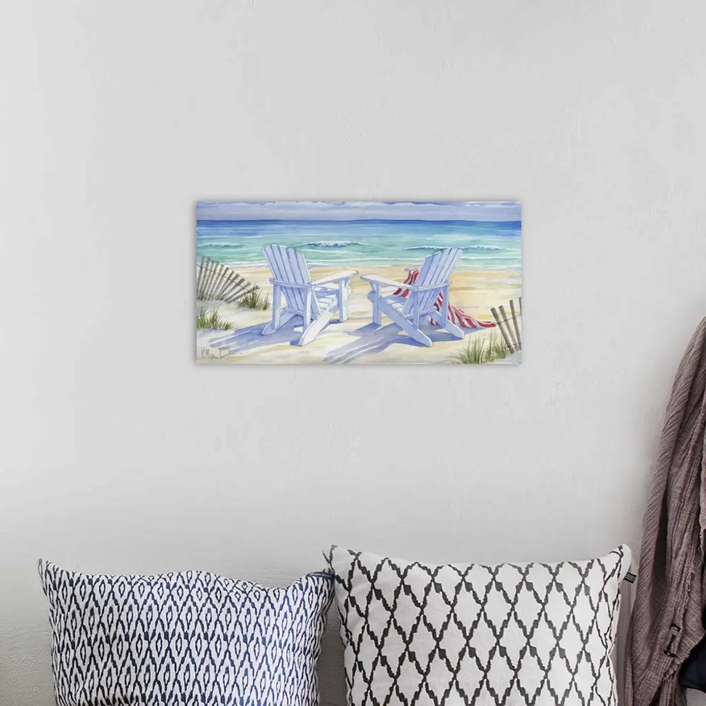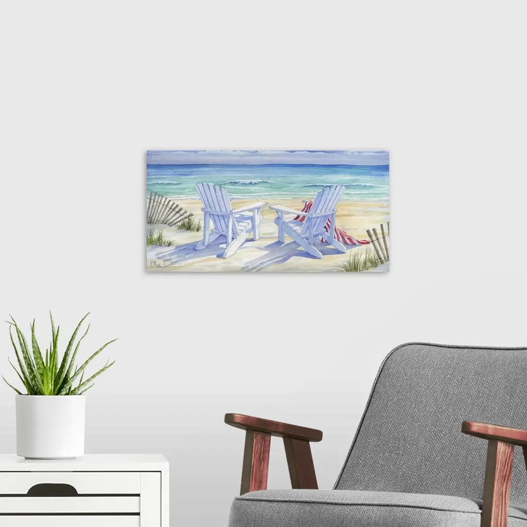 Watercolor painting of two adirondack chairs on the beach next to dune fences.