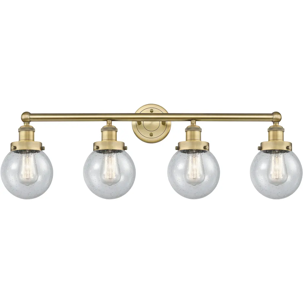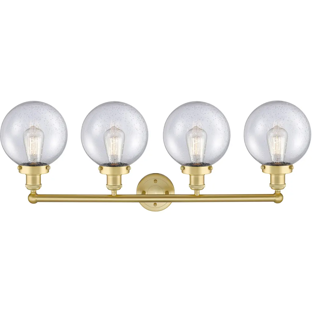 Beacon 4 Light 33.5 Inch Satin Gold Bath Vanity Light Wall Light In Seedy Glass, Large