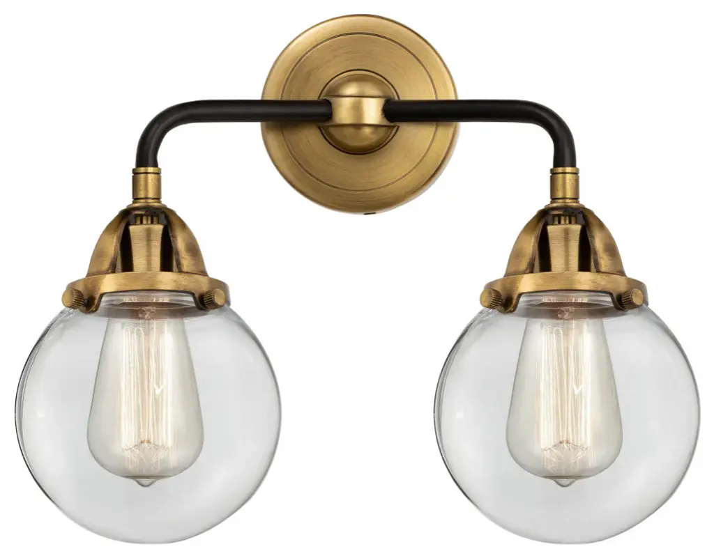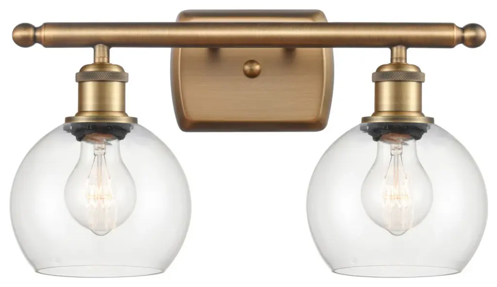 The Nouveau 2 is a highly detailed work of art that draws the eyes into its base and arm detail. The true show stopping piece is the beautifully curved glass shade that''s sure to wow you and guests alike.Features:Fixture can be hung with bulbs facing up or down4.5 inch 2mm heavy cast backplateDistance from outlet opening to top of fixture 2.25 inchesRated for 100 watt maximum per socketUL/CUL Damp RatedCompatible with Incandescent, LED, Fluorescent and Halogen bulbsNumber of Bulbs: 2Bulb Wattage: 60Bulb Type: IncandescentBulb Included: Not IncludedVoltage: 120Finish: Satin Gold, Clear