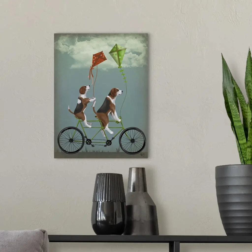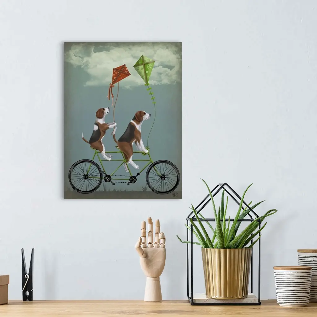 Decorative artwork of two Beagles riding on a tandem bicycle with a green and red kites attached.