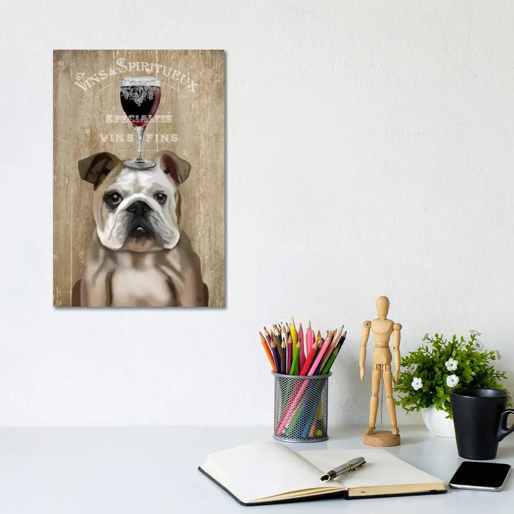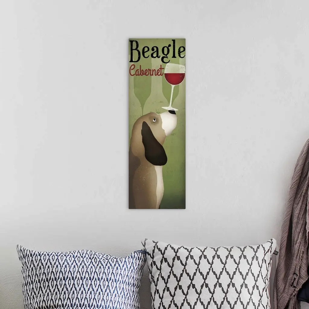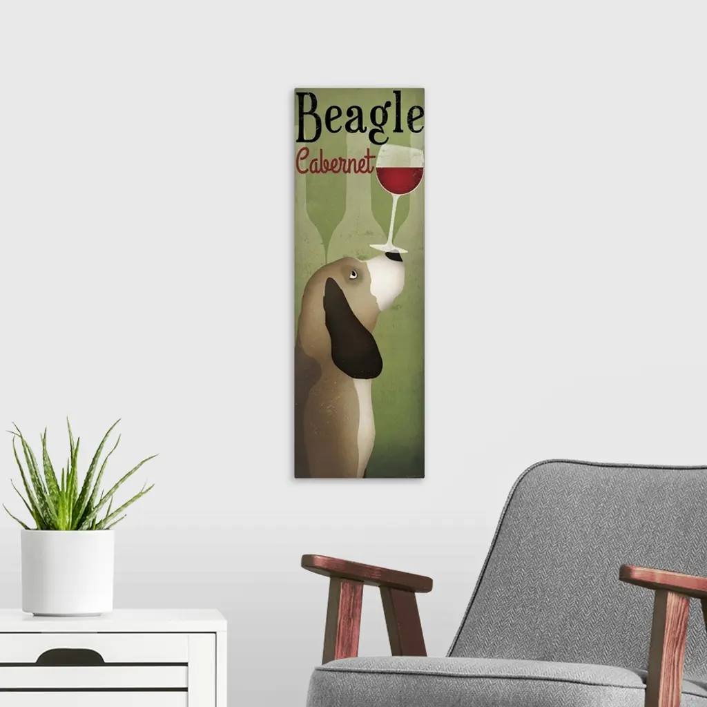 Contemporary home decor artwork of a beagle balancing a glass of red wine on its nose.