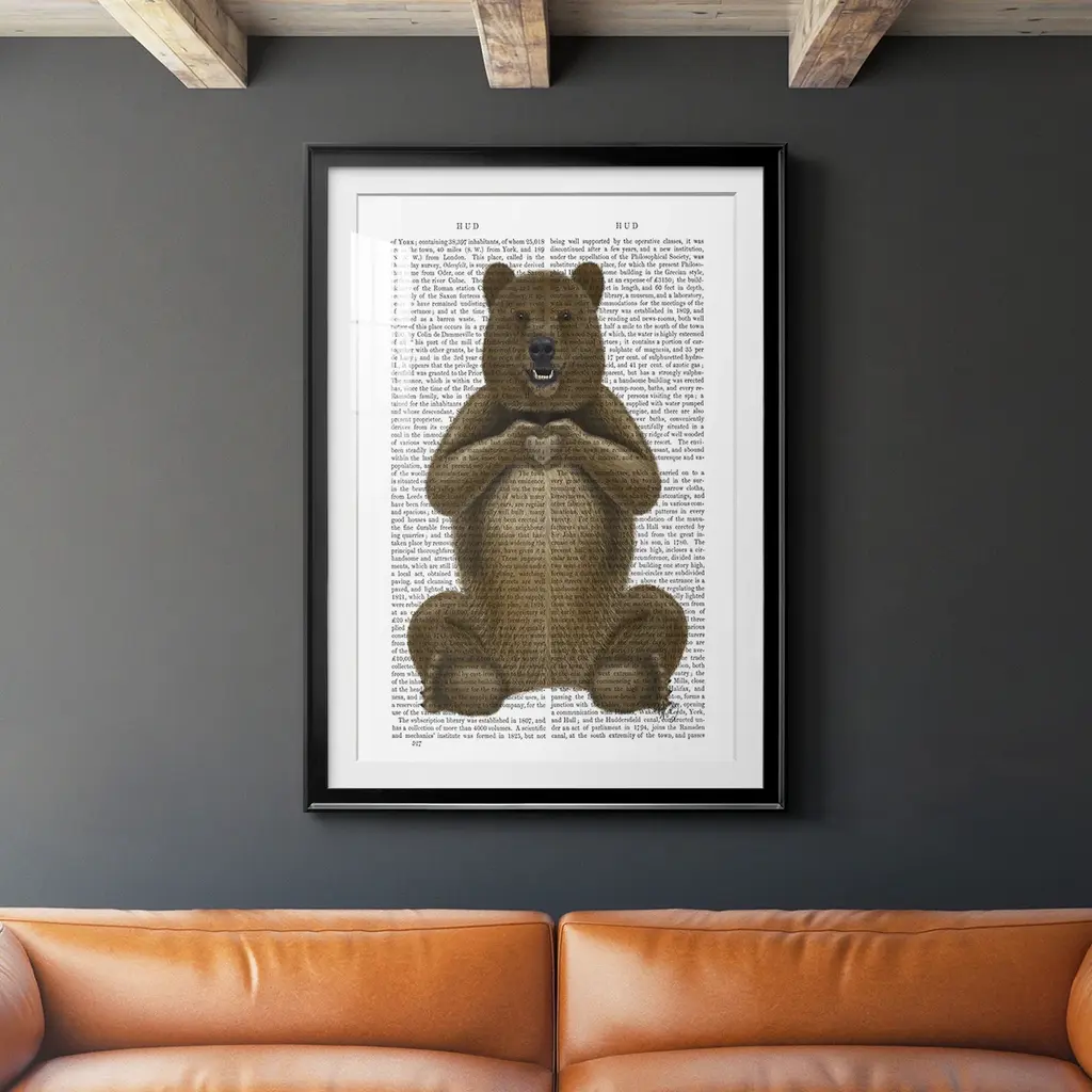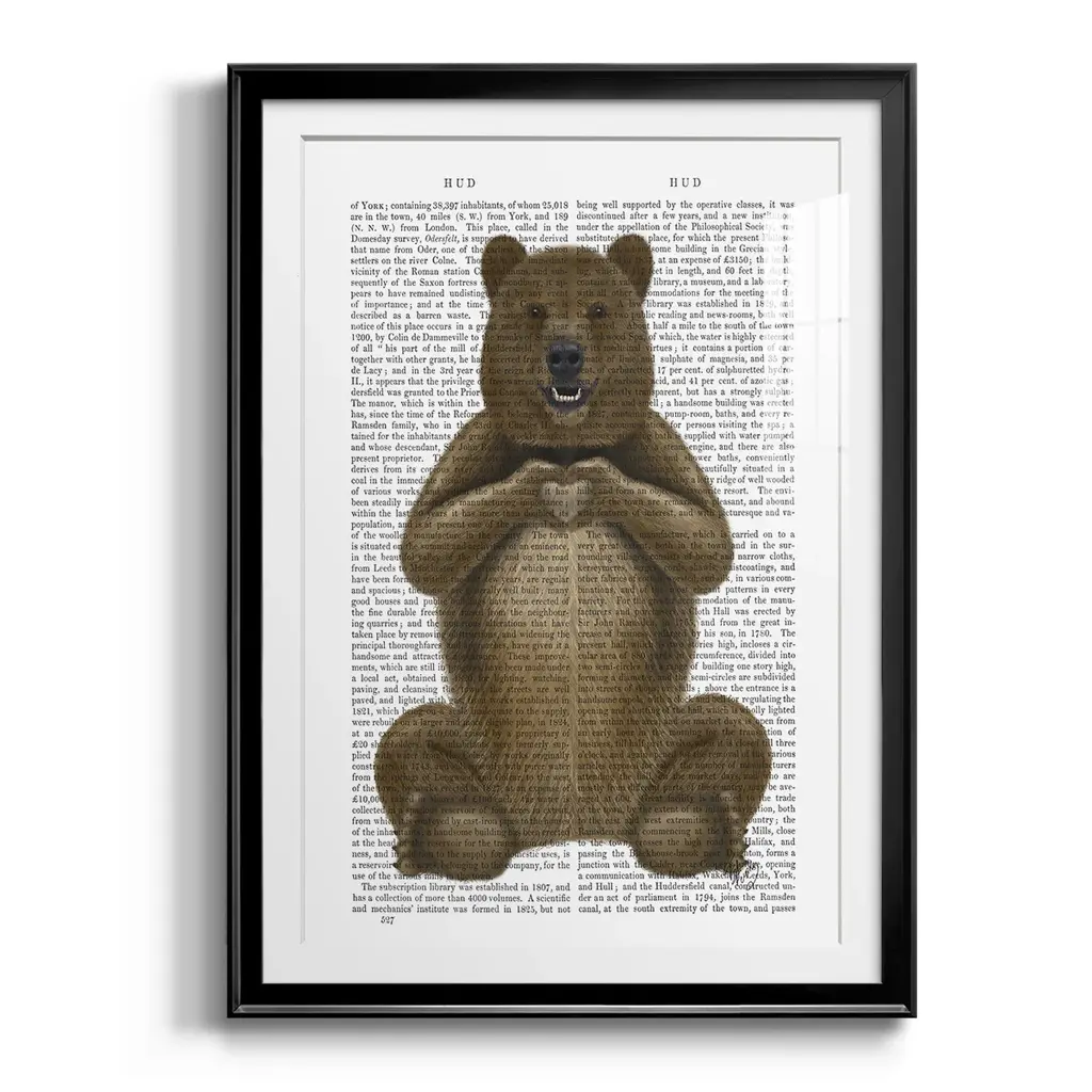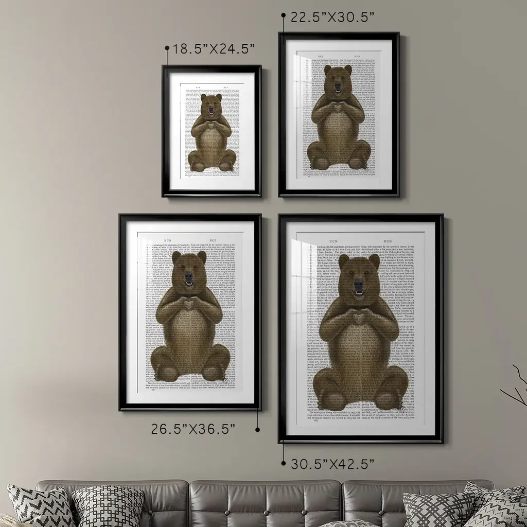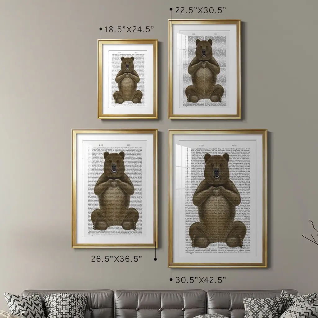 Bear and Hand Heart Premium Framed Print - Ready to Hang A Premium Framed Print created to last. Framed in distressed wood and available in an array of sizes and colors Featuring a beveled a solid wood stretcher bar, each piece comes ready to hand 4 SIZES AVAILABLE 30.5''X42.5'' - Overall Size 26.5'X36.5'' - Overall Size 22.5''x30.5'' - Overall Size 18.5''x24.5'' - Overall Size Each piece is made to order. Each piece comes with hanging hardware. Made in the USA Ready to Hang Giclee Paper Print Acrylic Glass Beveled Matt Board