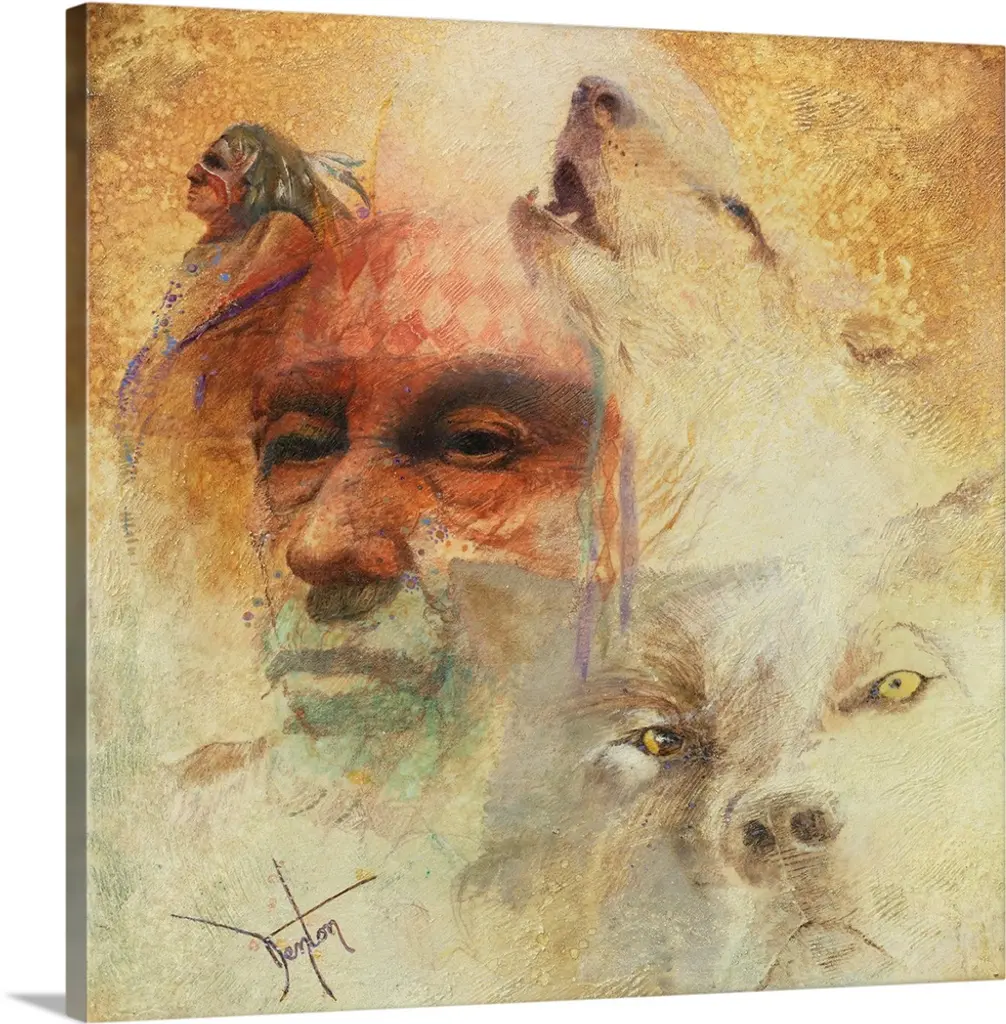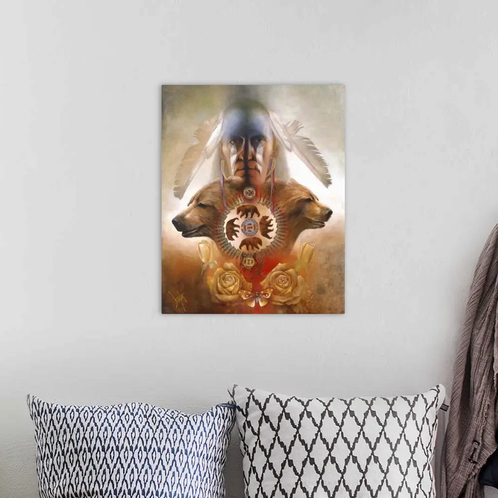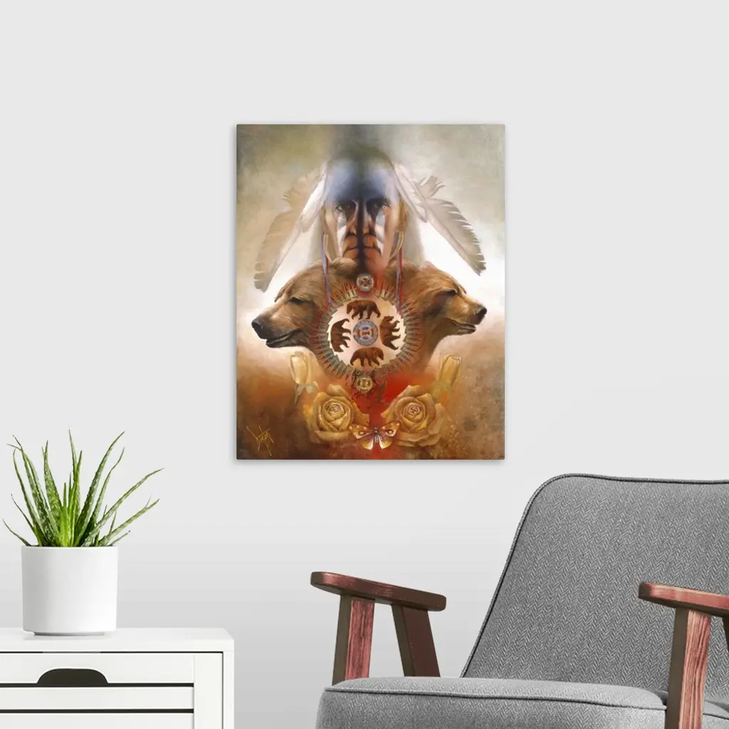 A contemporary painting of a Native American man staring straight on with feathers in his hair and two brown bear profile and yellow flowers sit at the bottom of the image.
