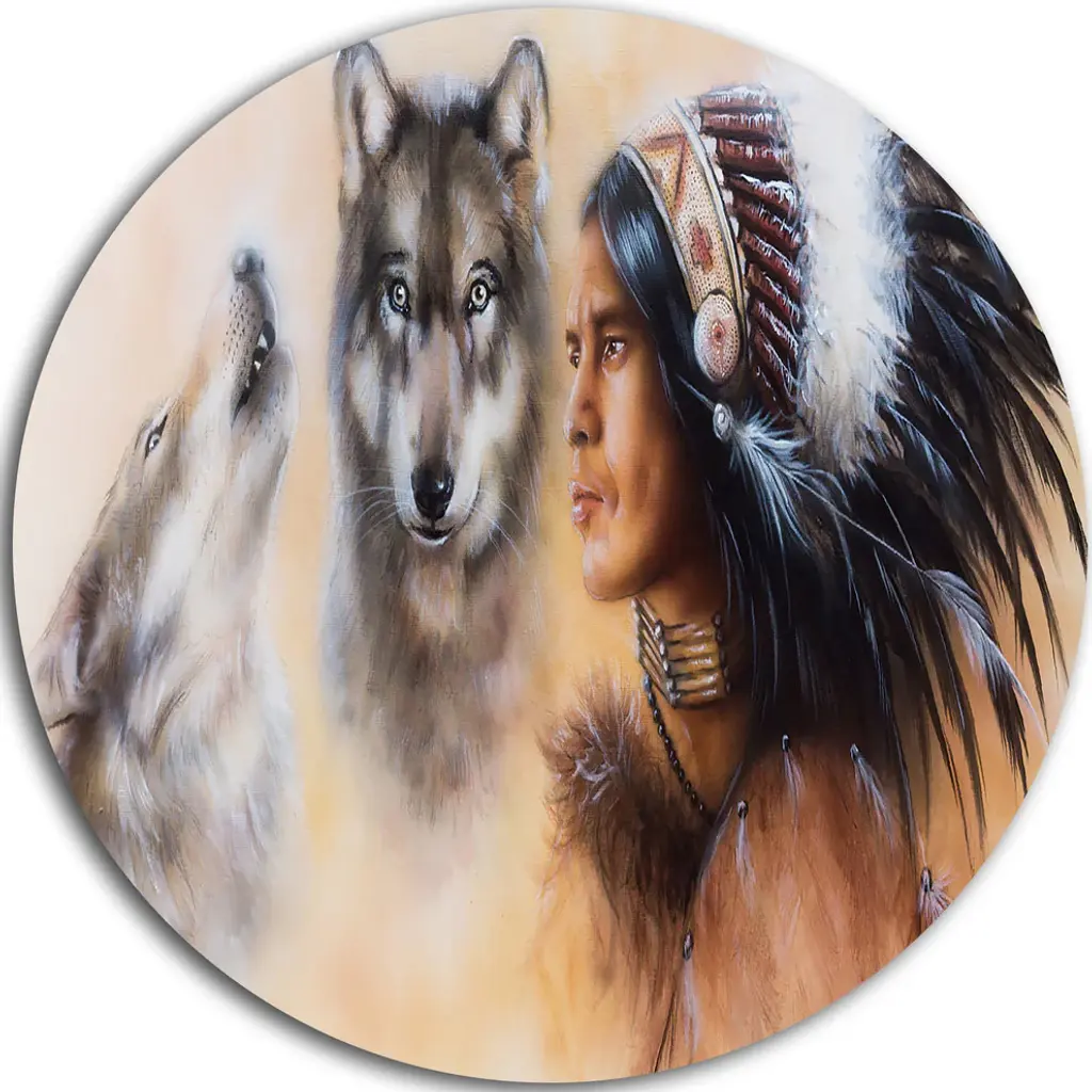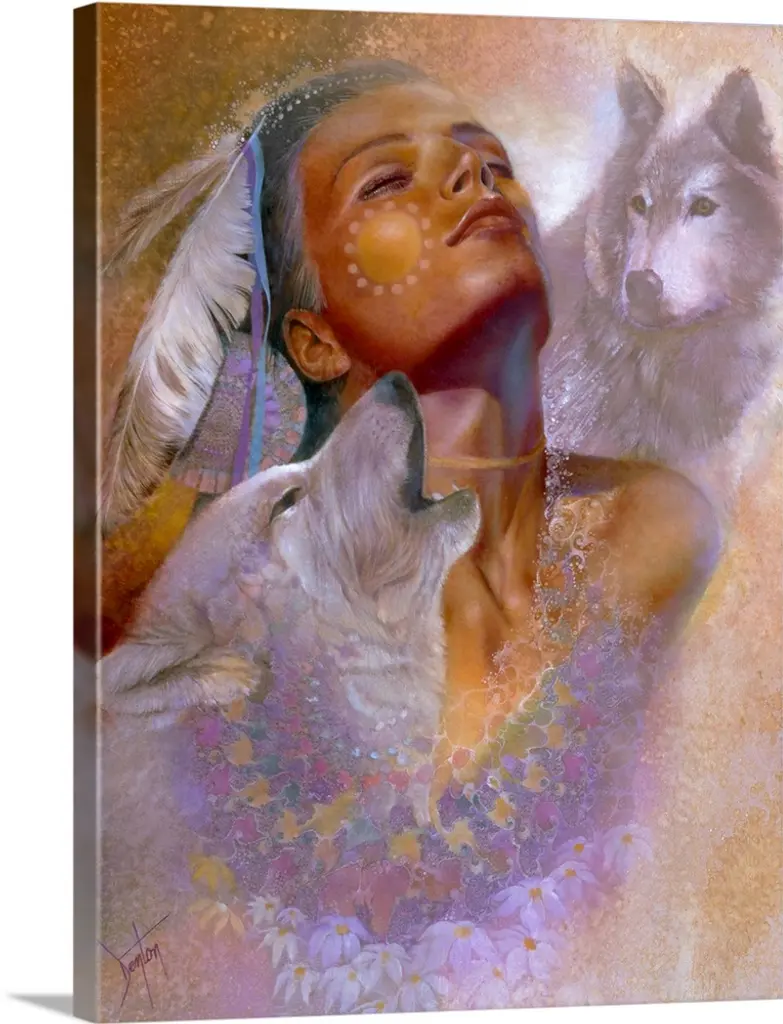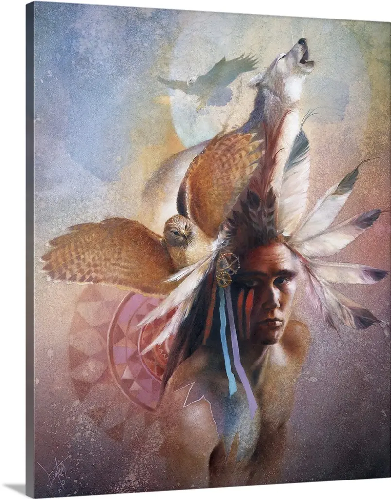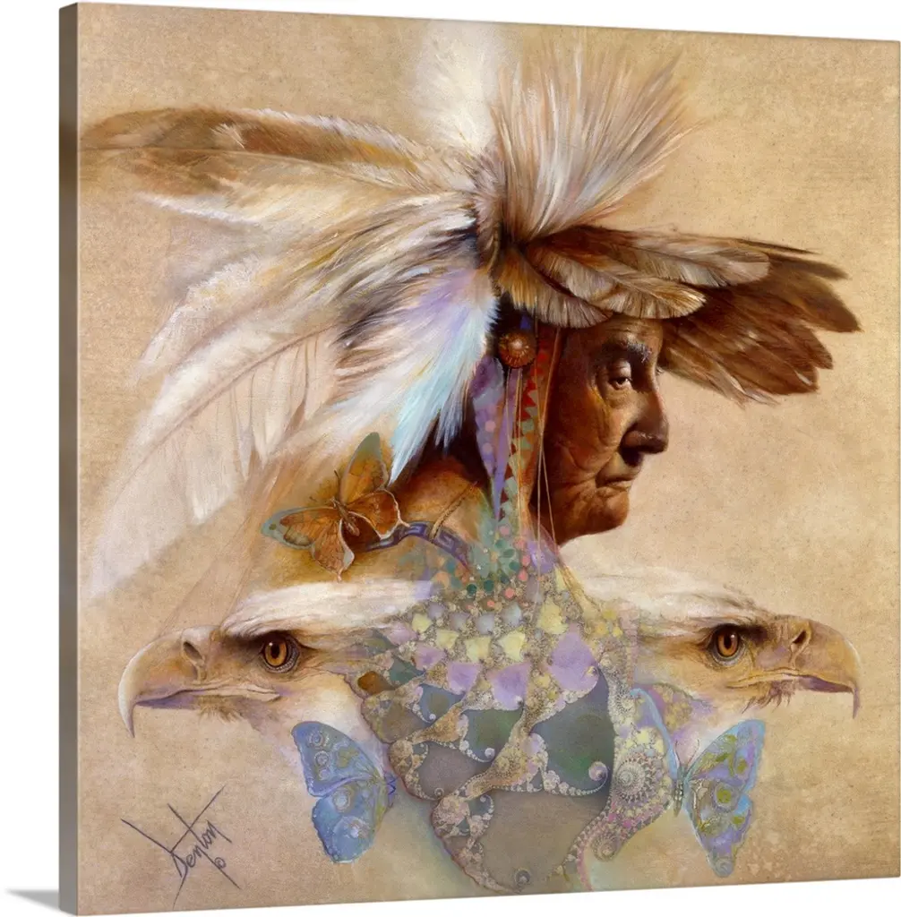 A contemporary painting of a Native American man staring straight on with feathers in his hair and two brown bear profile and yellow flowers sit at the bottom of the image.
