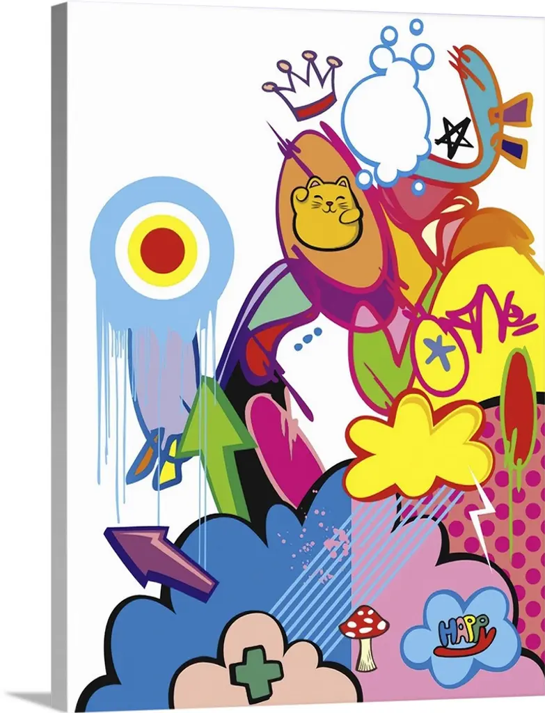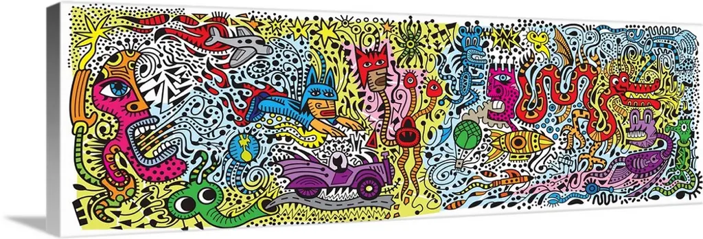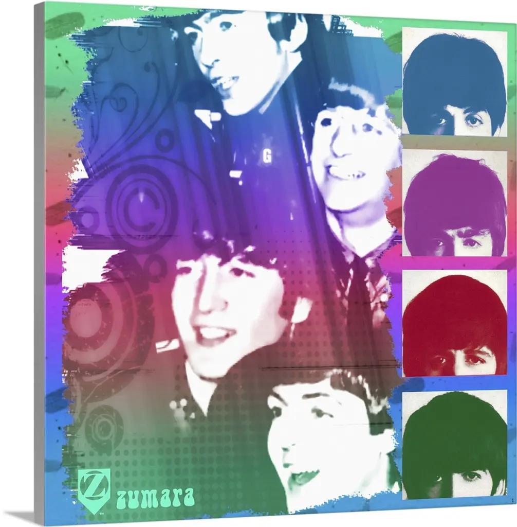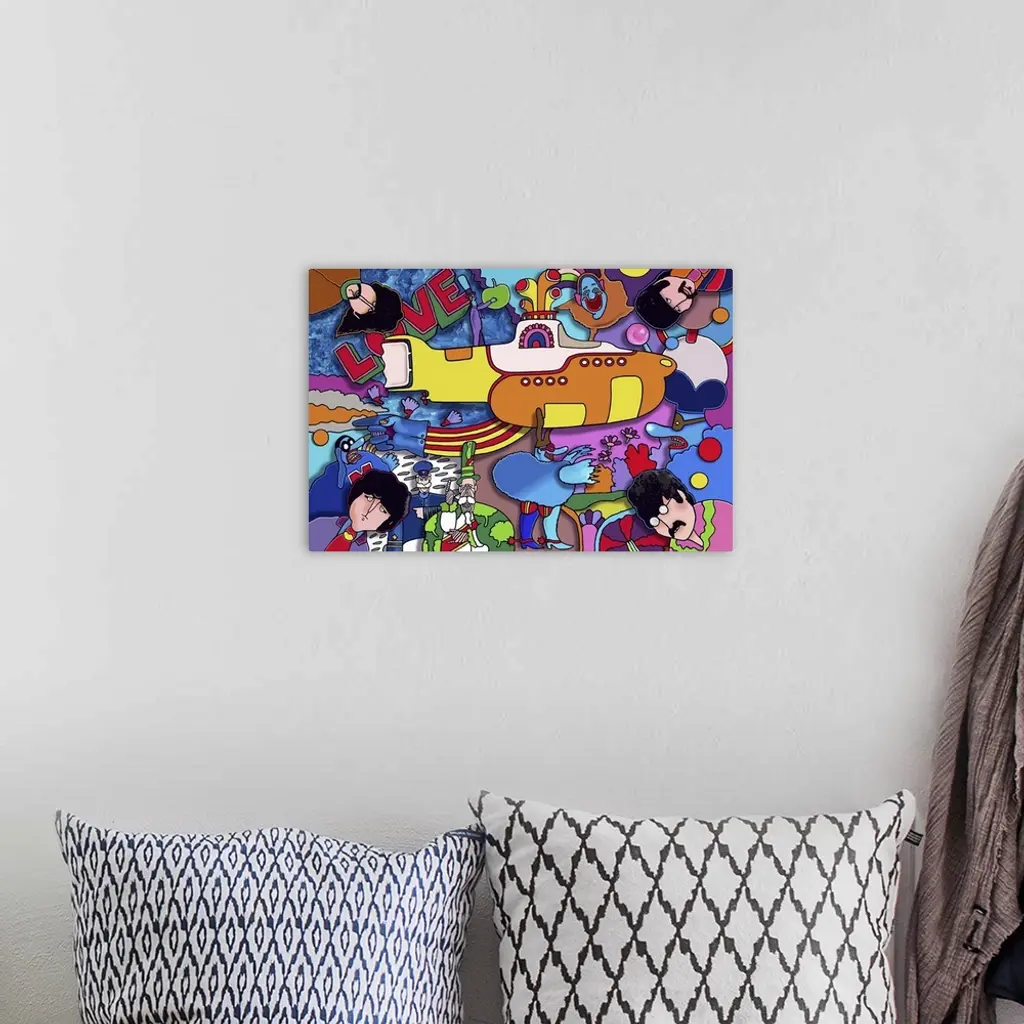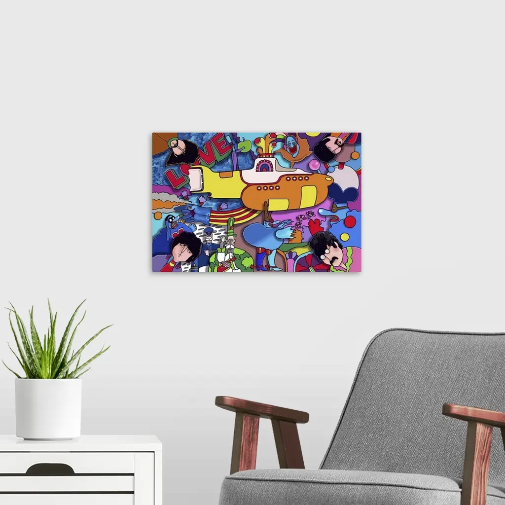 Contemporary artwork of a yellow submarine surrounded by bright colors and musical artists.