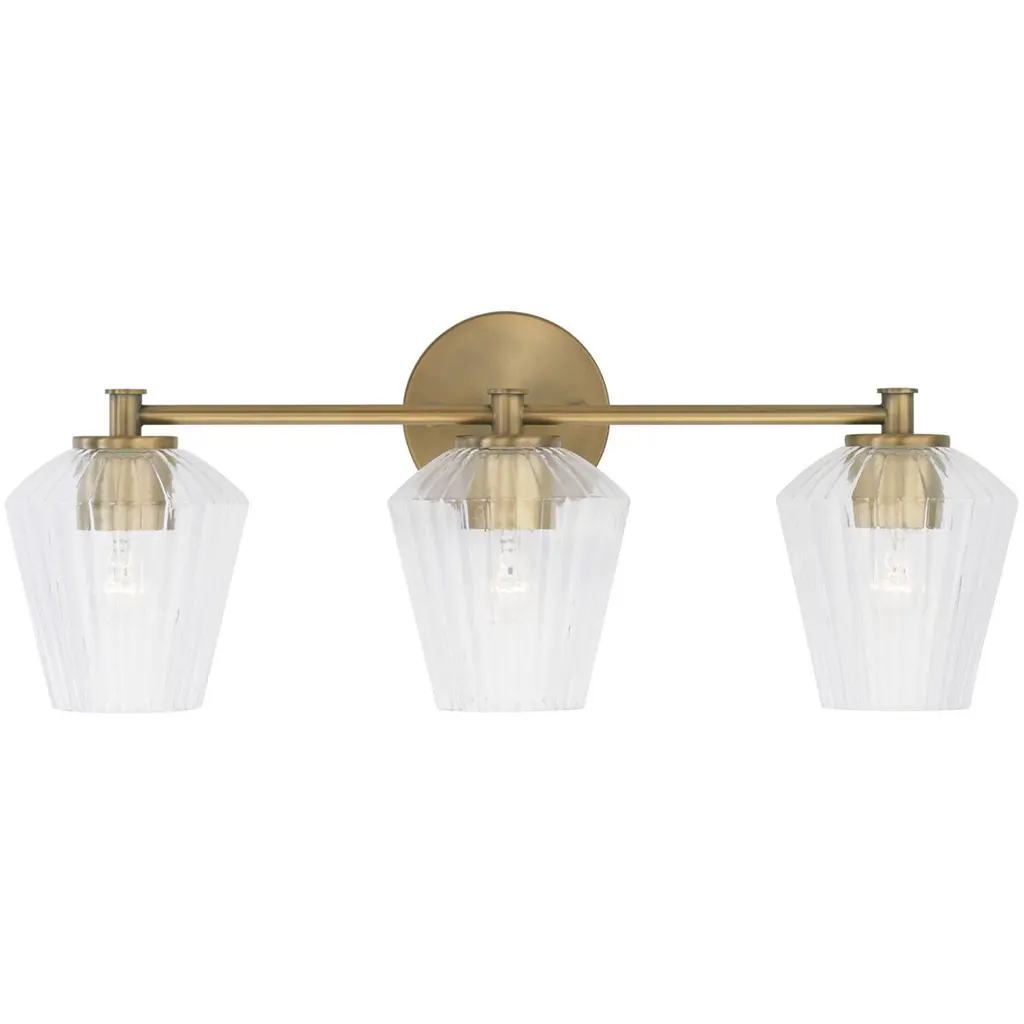 The architectural detailing of the fluted glass of this 3-Light Vanity creates brillinat shine for a luxe look that is effortlessly elegant. Finished in Aged Brass, this fixture is available as a 2-light, 3-light or 4-light.
