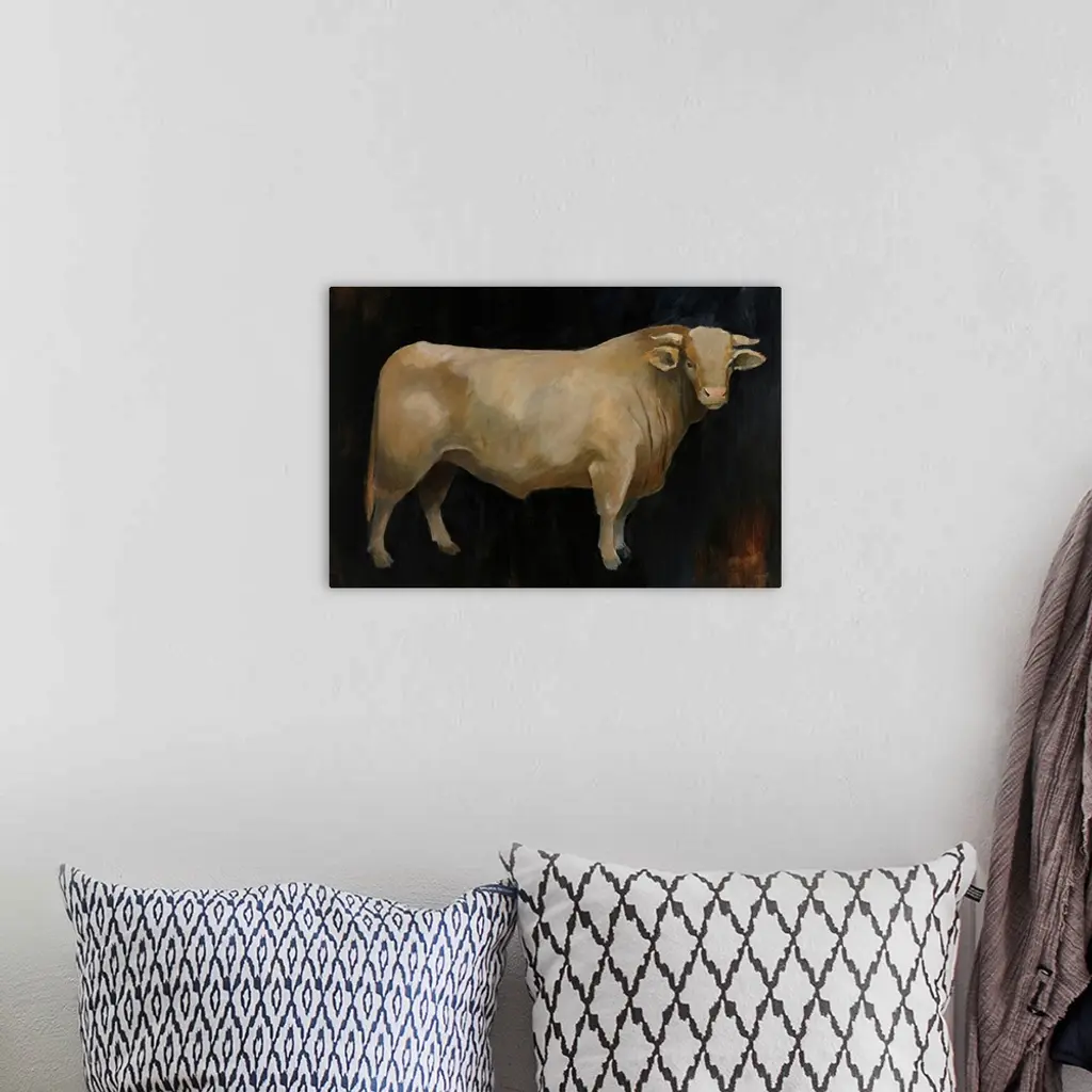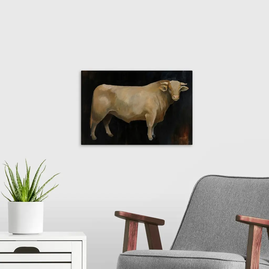 Contemporary painting of a brown cow on a dark background.