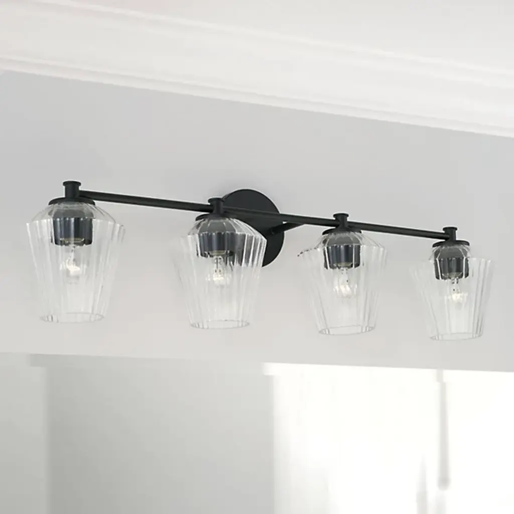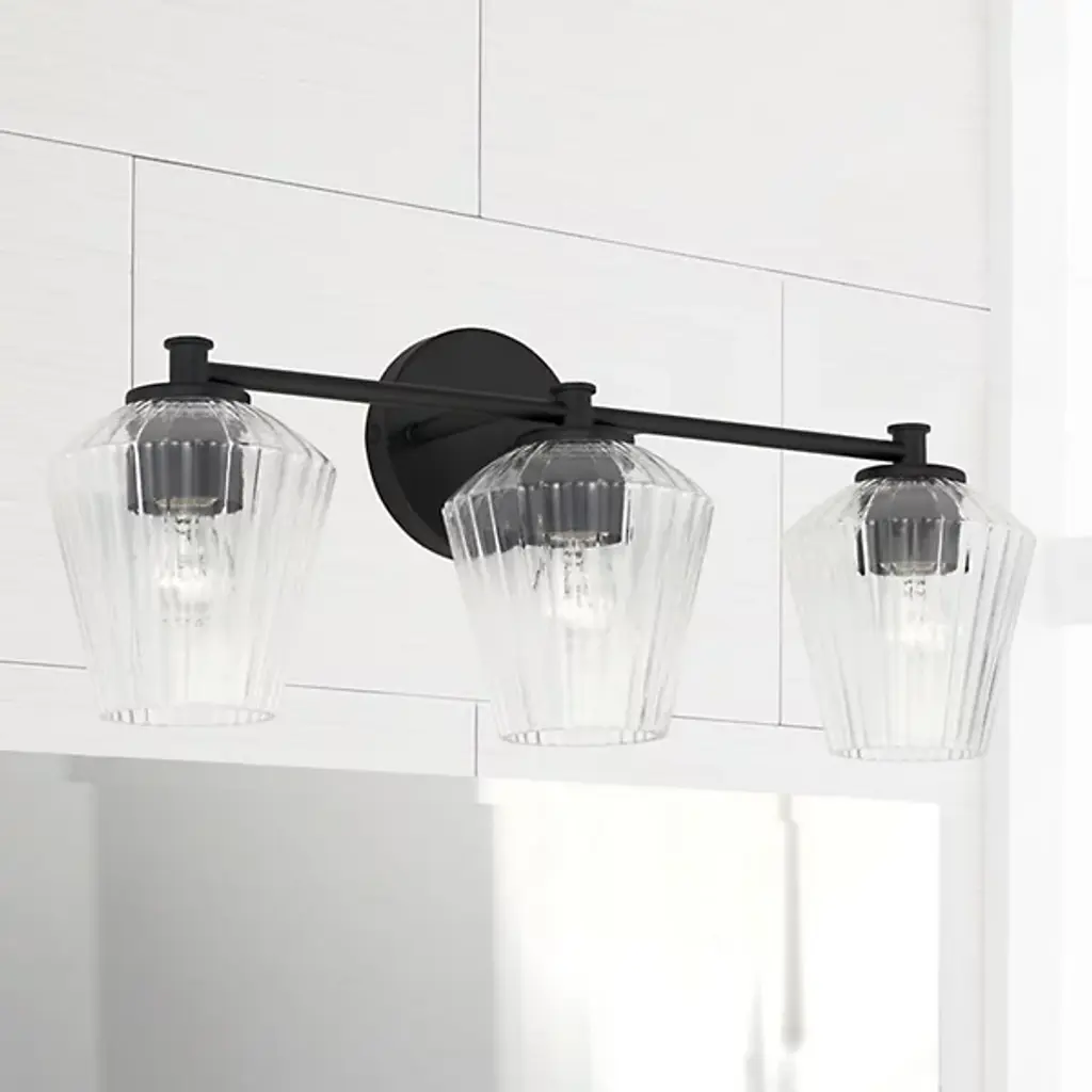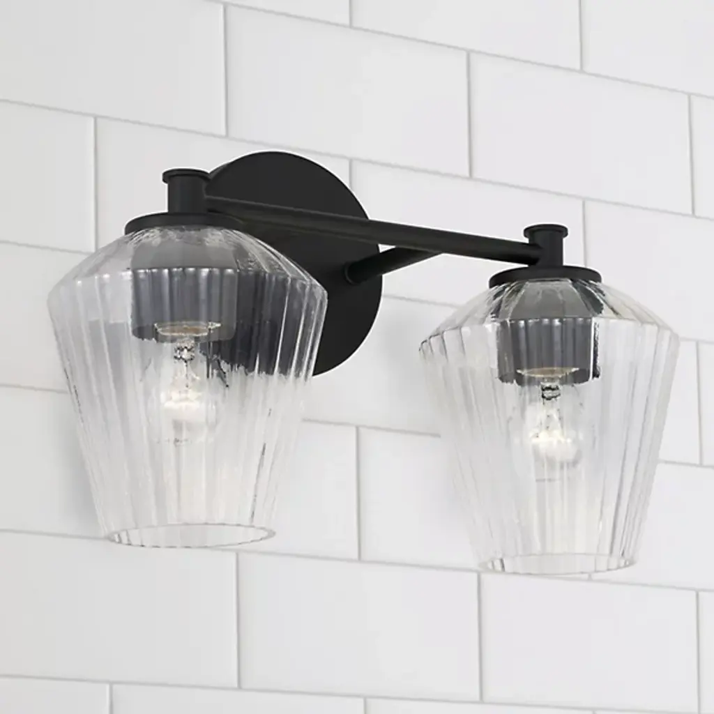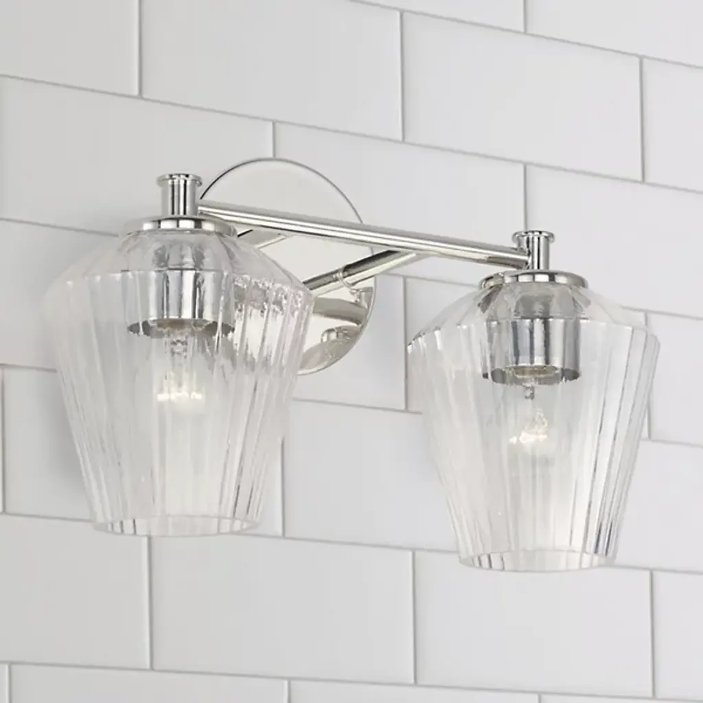 Metal and glass come together to form a striking silhouette in your home. The Beau Vanity Light from Capital Lighting mounts directly to the wall with a round backplate. An arm extends from the backplate, leading to a horizontal arm that upholds a set of crisp, fluted glass shades. Each shade contains a single, downward-facing bulb that introduces a crisp and even glow. The light diffuses with ease through the glass, bathing the entire room in its welcoming presence.