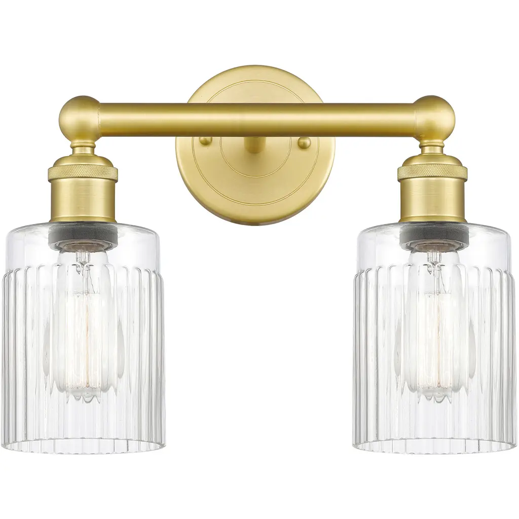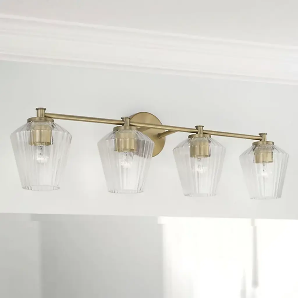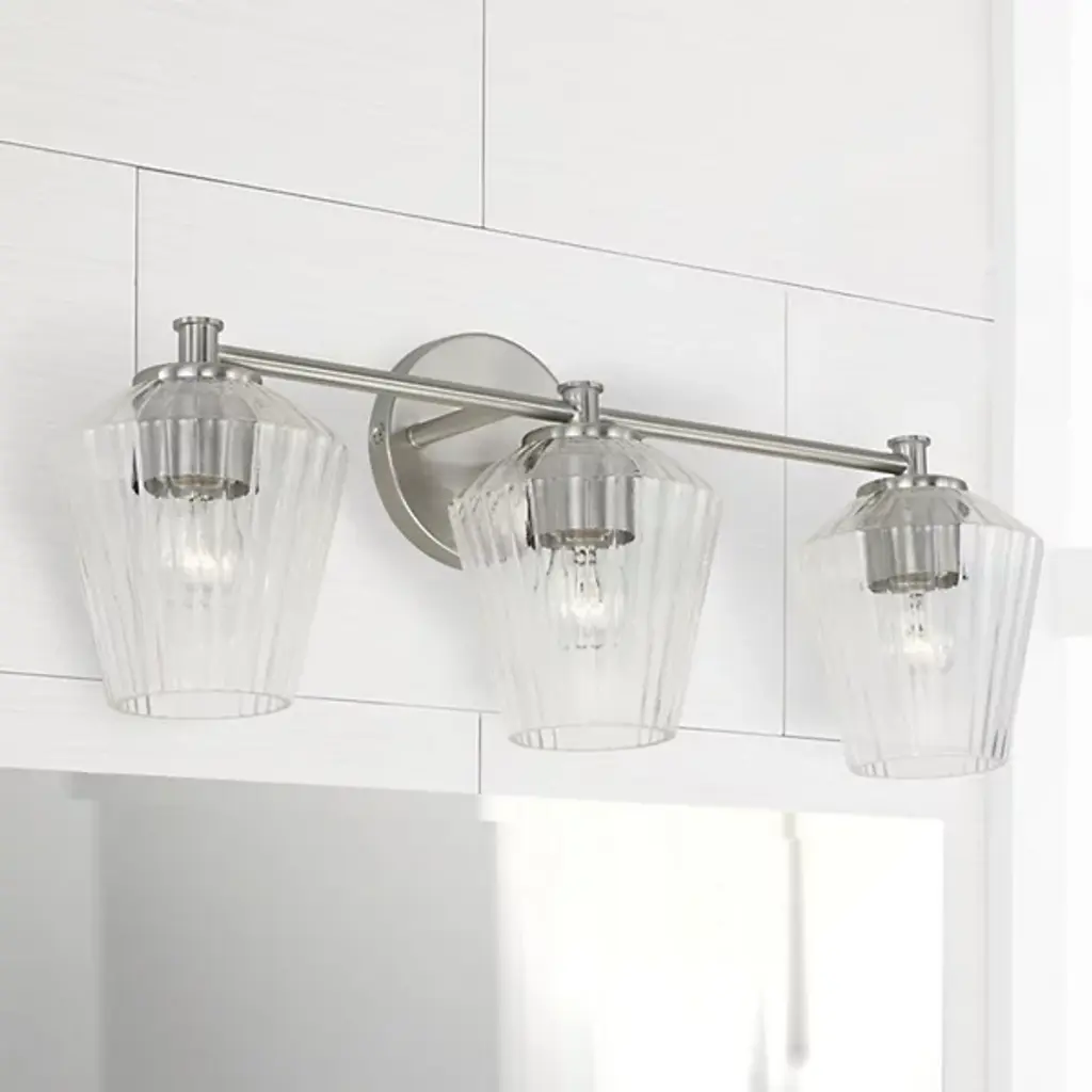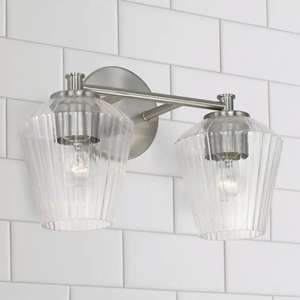 Metal and glass come together to form a striking silhouette in your home. The Beau Vanity Light from Capital Lighting mounts directly to the wall with a round backplate. An arm extends from the backplate, leading to a horizontal arm that upholds a set of crisp, fluted glass shades. Each shade contains a single, downward-facing bulb that introduces a crisp and even glow. The light diffuses with ease through the glass, bathing the entire room in its welcoming presence.