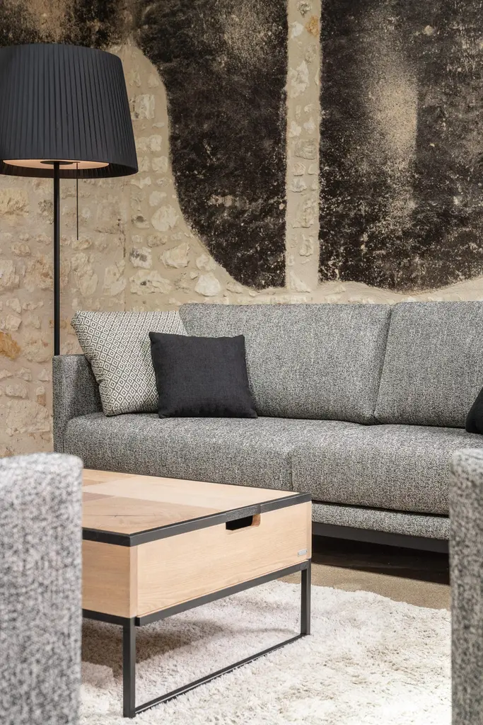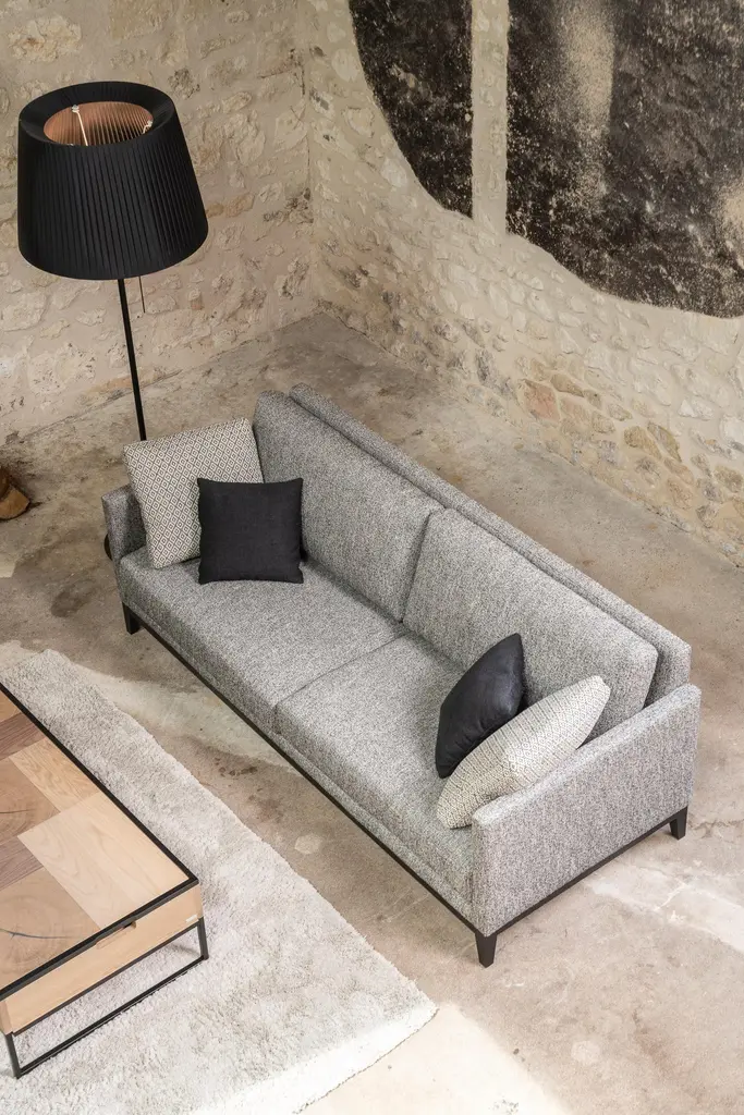 Beaubourg Sofa by RALPH MDimensions: W 220 x D 90 x H 88 cm. Materials: Solid beech, Particle board panels, Metal, Fabric. Details:Frame: Solid beech and particle board panels. Frame stiffened using metal plates.Seat springing: Interlaced elastic webbing.Seat cushion: High resilience 36kg/m3 foam wrapped in contact foam. Depth-adjustable strap and buckle fixing. Silicone hollow fibre beneath quilted percal cotton.Back cushion: Hollow siliconized fibre in percale compartmentalized case.Finish: Single and double overstitching.Base: Solid beech.Ralph M:In its French workshop, Ralph M. creates and crafts personalisable top-quality sofas and armchairs. A bold challenge. And one achieved successfully for more than 30 years. The Ralph M. team fulfils the essential challenge of the Made in France label: guaranteed quality through the ability to combine the best materials with expertise and open-minded flexibility.For more than 30 years, Ralph M. has used its expertise and attention to detail in creating pieces that draw on the latest trends in furniture. But they also enjoy exercising their own bold originality. In fact, they like it so much that they always want to go further in asserting their unique aesthetic.The new RALPH M. range embodies their desire to take creative risks and enhance the standard pieces of the furniture repertoire by revisiting them.They believe that design is as valid an artistic expression as literature, painting and music. The RALPH M. brand makes everything possible. It is in many ways our laboratory in which luxury, comfort and good design come together to create timeless pieces with their own distinct identity.
