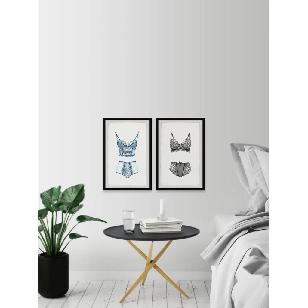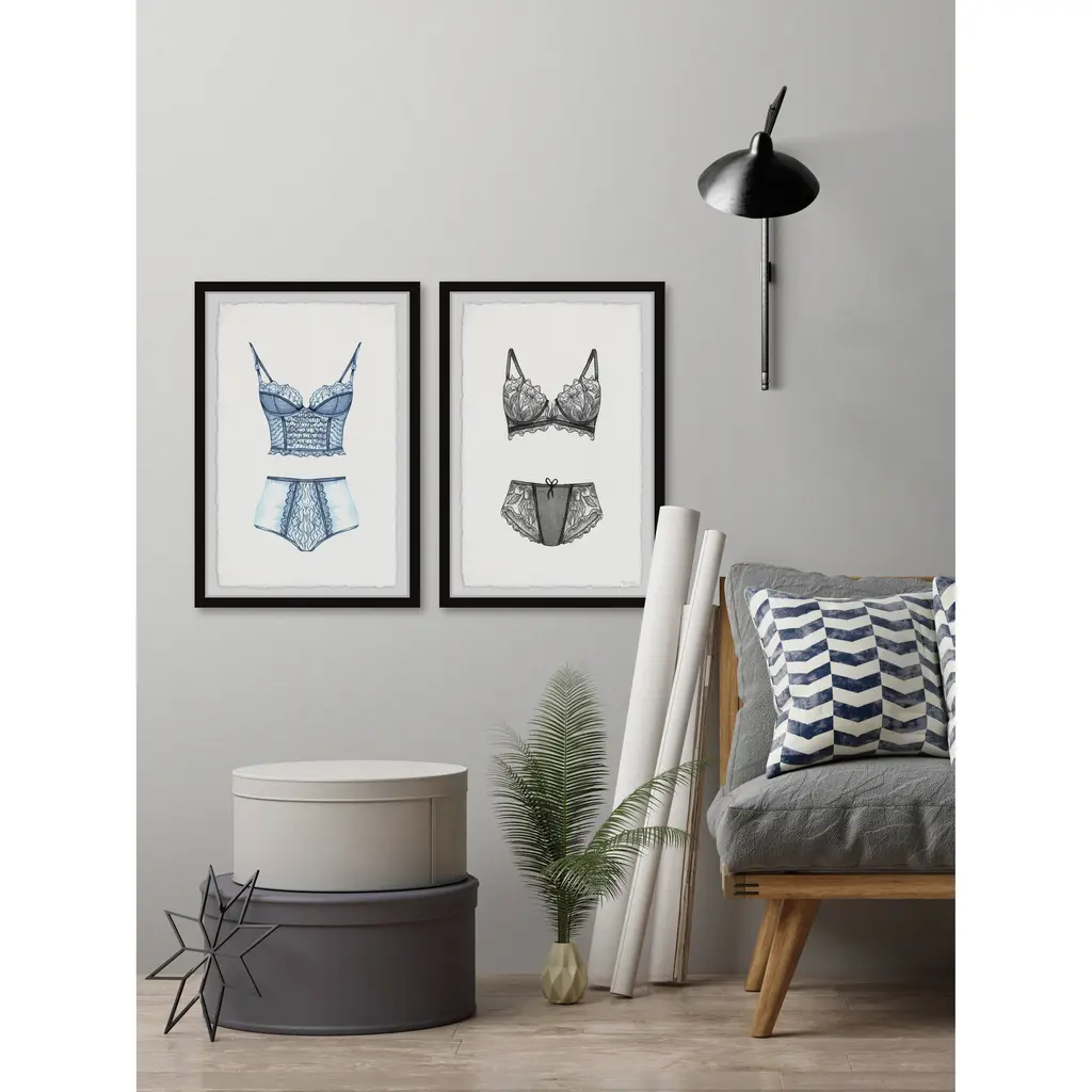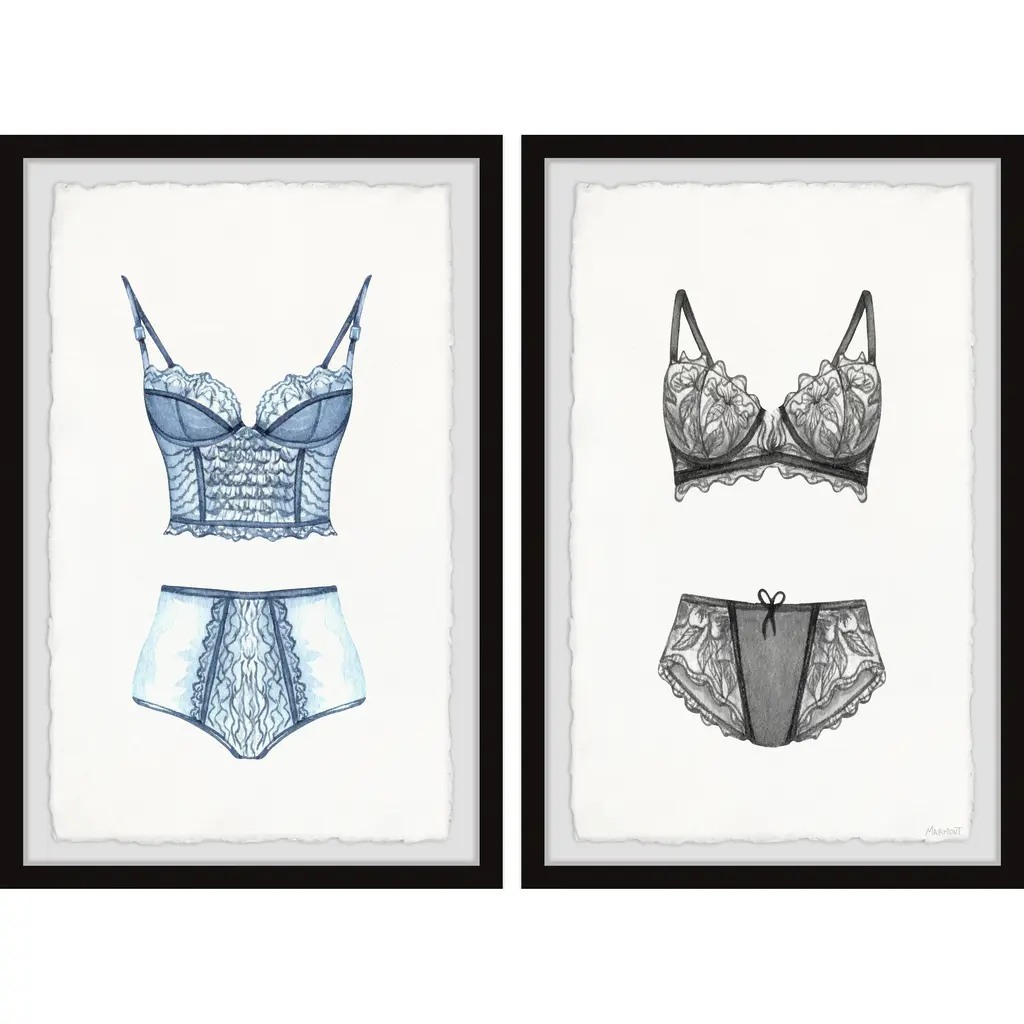 This duo of watercolor painting prints is perfect for any walkway or bedroom in the house, featuring two sets of lingerie in colors black and blue that complement each other wonderfully. Proudly printed in the USA, this piece is printed on high quality archive paper and professionally hand-framed. With wall-mounting hooks included, this artful accent is ready to hang up as soon as it reaches your front door. • Top quality Giclee print on high resolution Archive Paper • Hand cut deckled edges • High quality durable non-warping frame • Finished under shatter resistant plexiglass • Arrives ready to hang • Includes a certificate of authenticity • Printed in the USA