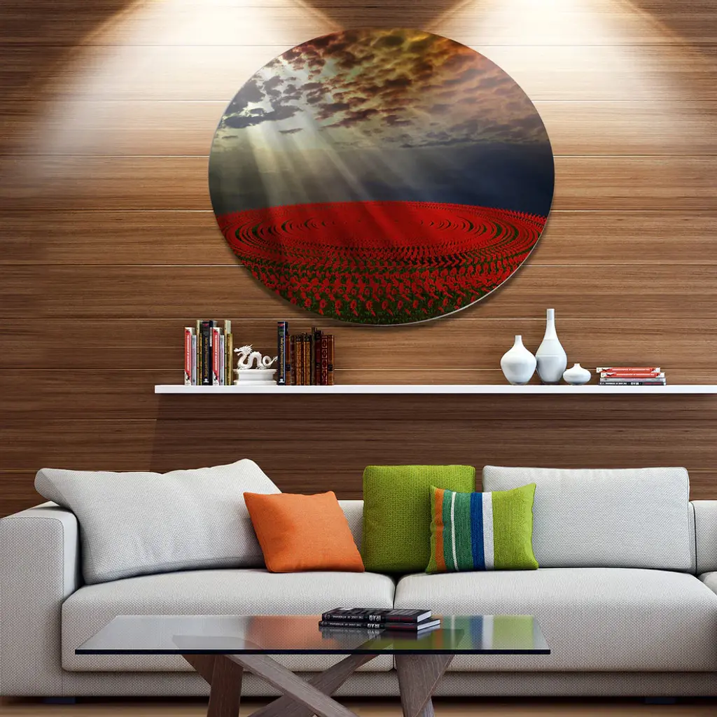 Bring Contemporary Abstraction to your home with this large Circle Metal wall art. This Beautiful Circled Flower Fields Metal Artwork makes it the focal point of any room or office. - White Gloss Coating ensures colors are extra vibrant with light reflection.- Aluminum grade Sheet Metal with 1 inch mounting frame on the back giving the illusion that the artwork is floating on the wall..- Mounting Brackets are included along with instructions.- High Quality Digital images are created directly into a glossy aluminum panel producing a stunning and captivating print into the glossy finish of the metal.- Water, Fire and Scratch resistant HD Aluminum panels.- Looks better than any photo paper and guaranteed to last at least 20 years- Easy to clean with a microfiber cloth. Colors are far superior to regular Canvas Art. - Easy to Hang
