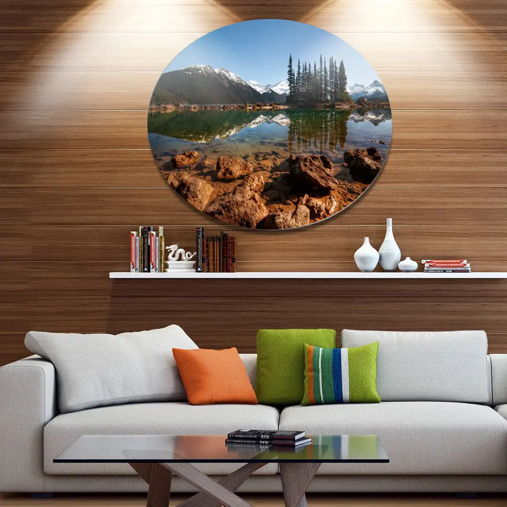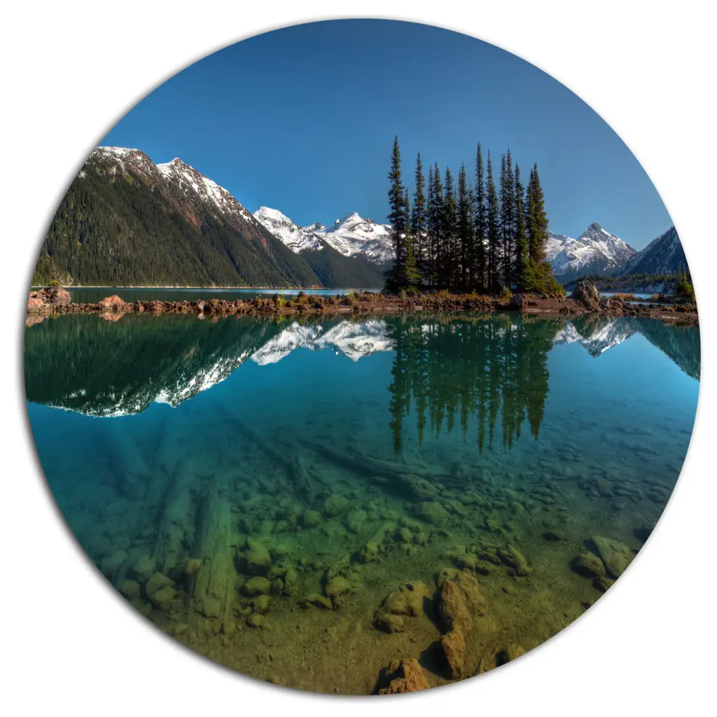 Bring Contemporary Abstraction to your home with this large Circle Metal wall art. This Beautiful Clear Lake with Pine Trees Metal Artwork makes it the focal point of any room or office. - White Gloss Coating ensures colors are extra vibrant with light reflection.- Aluminum grade Sheet Metal with 1 inch mounting frame on the back giving the illusion that the artwork is floating on the wall..- Mounting Brackets are included along with instructions.- High Quality Digital images are created directly into a glossy aluminum panel producing a stunning and captivating print into the glossy finish of the metal.- Water, Fire and Scratch resistant HD Aluminum panels.- Looks better than any photo paper and guaranteed to last at least 20 years- Easy to clean with a microfiber cloth. Colors are far superior to regular Canvas Art. - Easy to Hang