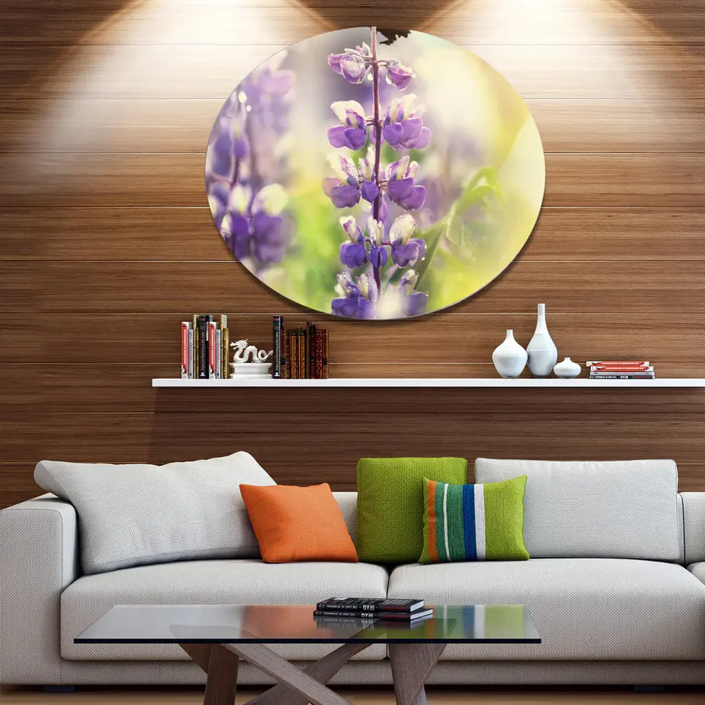 Bring Contemporary Abstraction to your home with this large Circle Metal wall art. This Beautiful Close-Up of Blue Lupin Flowers Metal Artwork makes it the focal point of any room or office. - White Gloss Coating ensures colors are extra vibrant with light reflection.- Aluminum grade Sheet Metal with 1 inch mounting frame on the back giving the illusion that the artwork is floating on the wall..- Mounting Brackets are included along with instructions.- High Quality Digital images are created directly into a glossy aluminum panel producing a stunning and captivating print into the glossy finish of the metal.- Water, Fire and Scratch resistant HD Aluminum panels.- Looks better than any photo paper and guaranteed to last at least 20 years- Easy to clean with a microfiber cloth. Colors are far superior to regular Canvas Art. - Easy to Hang