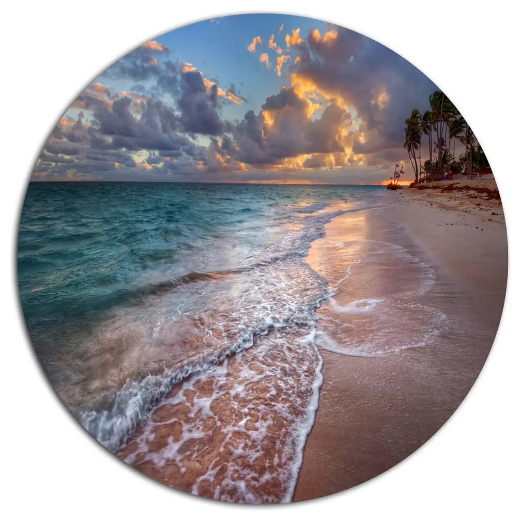 Bring Contemporary Abstraction to your home with this large Circle Metal wall art. This Beautiful Cloudscape over Beach Metal Artwork makes it the focal point of any room or office. - White Gloss Coating ensures colors are extra vibrant with light reflection.- Aluminum grade Sheet Metal with 1 inch mounting frame on the back giving the illusion that the artwork is floating on the wall..- Mounting Brackets are included along with instructions.- High Quality Digital images are created directly into a glossy aluminum panel producing a stunning and captivating print into the glossy finish of the metal.- Water, Fire and Scratch resistant HD Aluminum panels.- Looks better than any photo paper and guaranteed to last at least 20 years- Easy to clean with a microfiber cloth. Colors are far superior to regular Canvas Art. - Easy to Hang