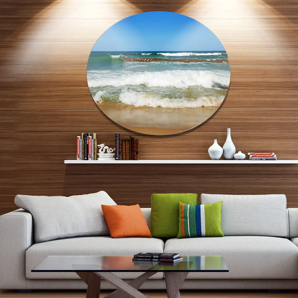 Bring Contemporary Abstraction to your home with this large Circle Metal wall art. This Beautiful Empty Beach under Blue Sky Metal Artwork makes it the focal point of any room or office. - White Gloss Coating ensures colors are extra vibrant with light reflection.- Aluminum grade Sheet Metal with 1 inch mounting frame on the back giving the illusion that the artwork is floating on the wall..- Mounting Brackets are included along with instructions.- High Quality Digital images are created directly into a glossy aluminum panel producing a stunning and captivating print into the glossy finish of the metal.- Water, Fire and Scratch resistant HD Aluminum panels.- Looks better than any photo paper and guaranteed to last at least 20 years- Easy to clean with a microfiber cloth. Colors are far superior to regular Canvas Art. - Easy to Hang