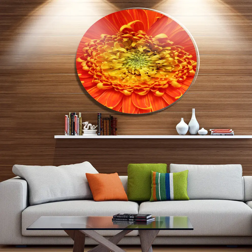 Bring Contemporary Abstraction to your home with this large Circle Metal wall art. This Beautiful Gerbera Flower In Brig Metal Artwork makes it the focal point of any room or office. - White Gloss Coating ensures colors are extra vibrant with light reflection.- Aluminum grade Sheet Metal with 1 inch mounting frame on the back giving the illusion that the artwork is floating on the wall..- Mounting Brackets are included along with instructions.- High Quality Digital images are created directly into a glossy aluminum panel producing a stunning and captivating print into the glossy finish of the metal.- Water, Fire and Scratch resistant HD Aluminum panels.- Looks better than any photo paper and guaranteed to last at least 20 years- Easy to clean with a microfiber cloth. Colors are far superior to regular Canvas Art. - Easy to Hang