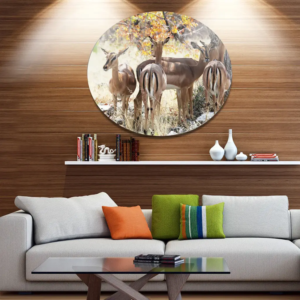 Bring Contemporary Abstraction to your home with this large Circle Metal wall art. This Beautiful Herd of Antelope Gnu Metal Artwork makes it the focal point of any room or office. - White Gloss Coating ensures colors are extra vibrant with light reflection.- Aluminum grade Sheet Metal with 1 inch mounting frame on the back giving the illusion that the artwork is floating on the wall..- Mounting Brackets are included along with instructions.- High Quality Digital images are created directly into a glossy aluminum panel producing a stunning and captivating print into the glossy finish of the metal.- Water, Fire and Scratch resistant HD Aluminum panels.- Looks better than any photo paper and guaranteed to last at least 20 years- Easy to clean with a microfiber cloth. Colors are far superior to regular Canvas Art. - Easy to Hang