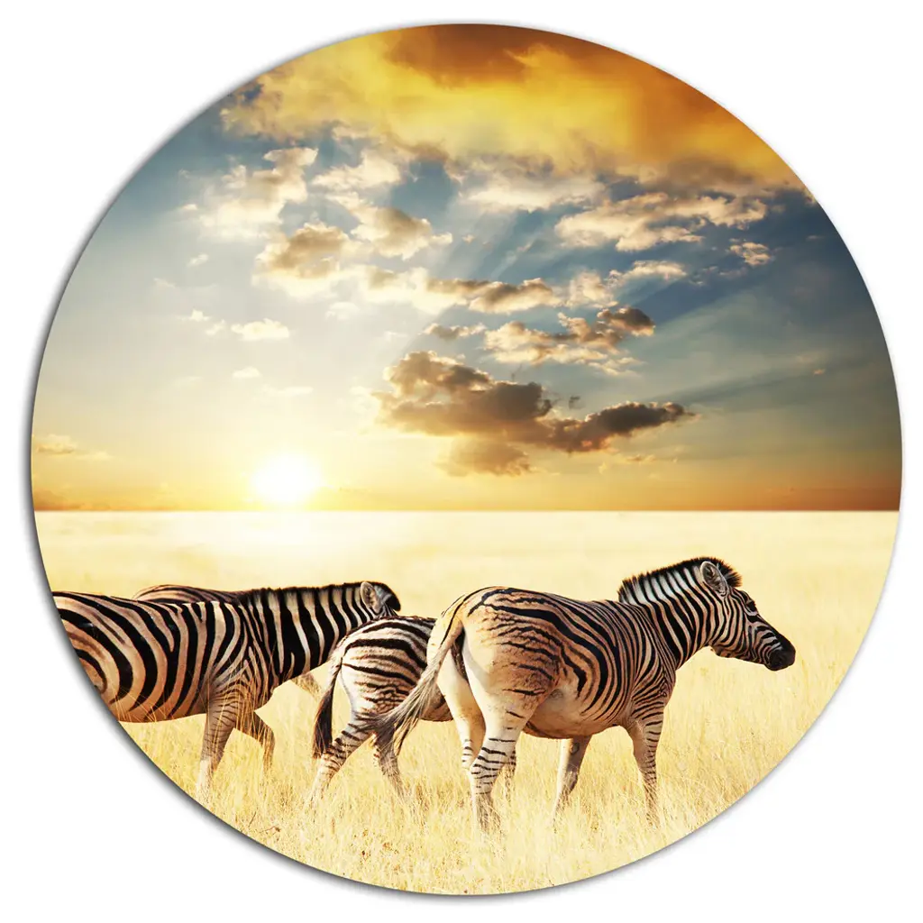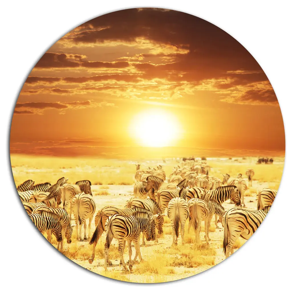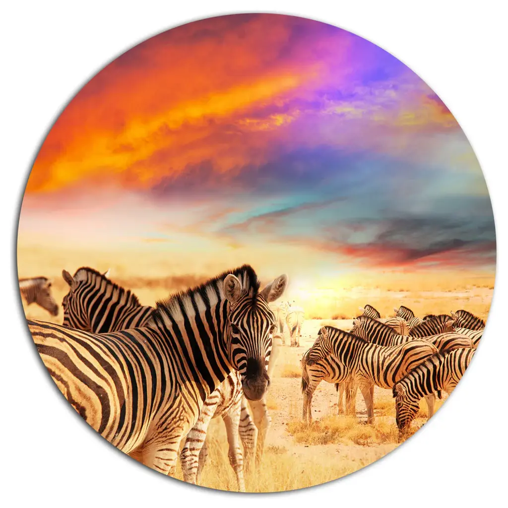 Bring Contemporary Abstraction to your home with this large Circle Metal wall art. This Beautiful Herd of Zebra on Bright Day Metal Artwork makes it the focal point of any room or office. - White Gloss Coating ensures colors are extra vibrant with light reflection.- Aluminum grade Sheet Metal with 1 inch mounting frame on the back giving the illusion that the artwork is floating on the wall..- Mounting Brackets are included along with instructions.- High Quality Digital images are created directly into a glossy aluminum panel producing a stunning and captivating print into the glossy finish of the metal.- Water, Fire and Scratch resistant HD Aluminum panels.- Looks better than any photo paper and guaranteed to last at least 20 years- Easy to clean with a microfiber cloth. Colors are far superior to regular Canvas Art. - Easy to Hang