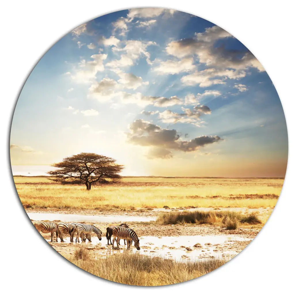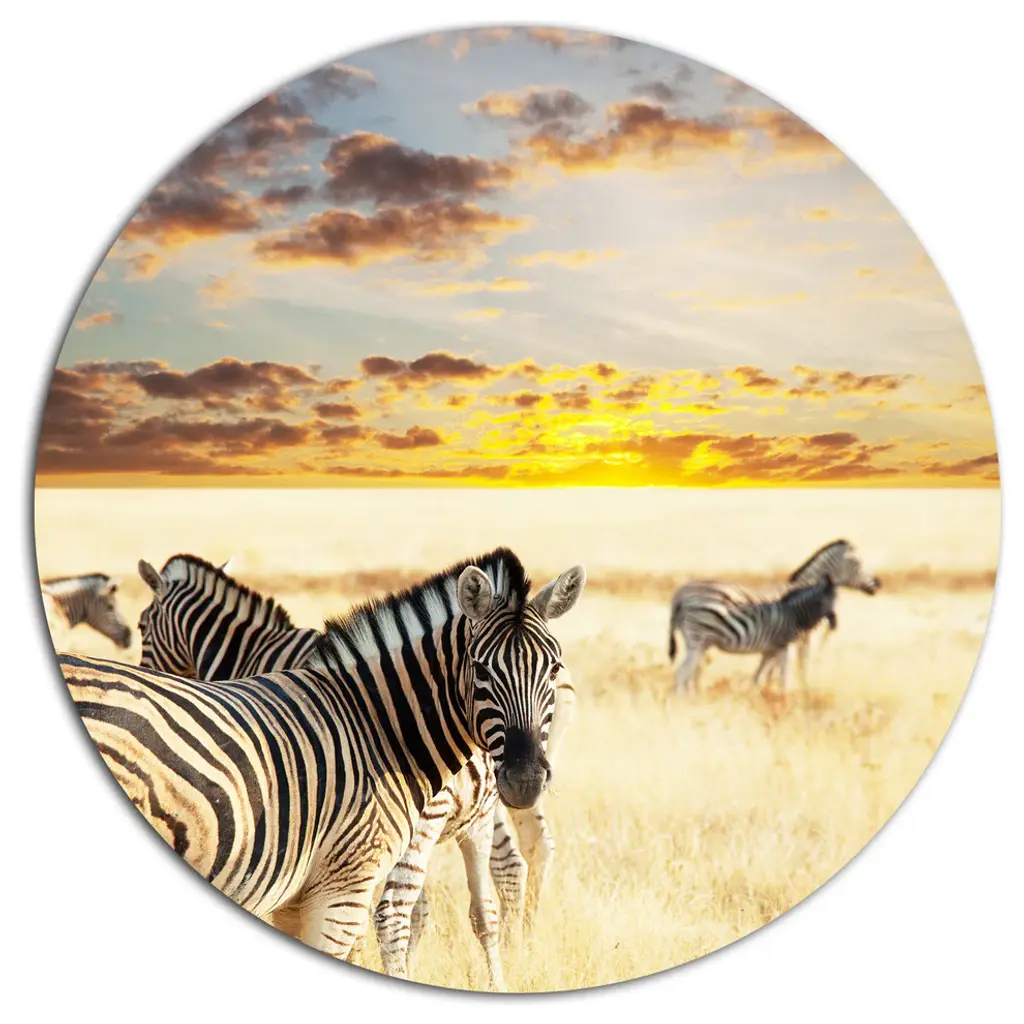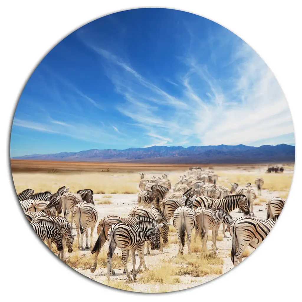Bring Contemporary Abstraction to your home with this large Circle Metal wall art. This Beautiful Herd of Zebra on Bright Day Metal Artwork makes it the focal point of any room or office. - White Gloss Coating ensures colors are extra vibrant with light reflection.- Aluminum grade Sheet Metal with 1 inch mounting frame on the back giving the illusion that the artwork is floating on the wall..- Mounting Brackets are included along with instructions.- High Quality Digital images are created directly into a glossy aluminum panel producing a stunning and captivating print into the glossy finish of the metal.- Water, Fire and Scratch resistant HD Aluminum panels.- Looks better than any photo paper and guaranteed to last at least 20 years- Easy to clean with a microfiber cloth. Colors are far superior to regular Canvas Art. - Easy to Hang