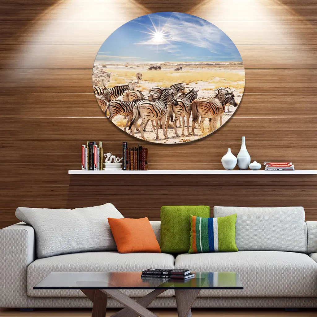 Beautiful Herd Of Zebra On Bright Day, African Round Metal Artwork, 23"