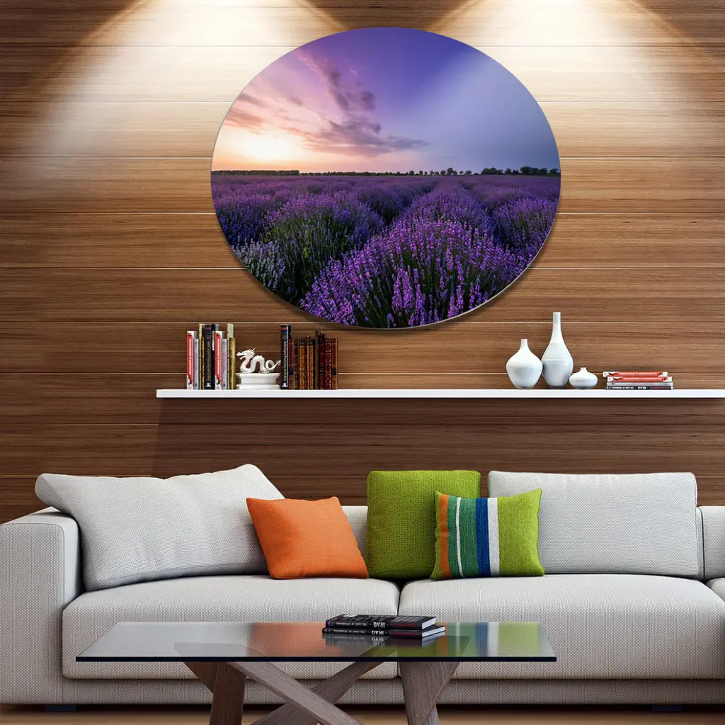 Bring Contemporary Abstraction to your home with this large Circle Metal wall art. This Beautiful Lavender Flowers At Sunset Metal Artwork makes it the focal point of any room or office. - White Gloss Coating ensures colors are extra vibrant with light reflection.- Aluminum grade Sheet Metal with 1 inch mounting frame on the back giving the illusion that the artwork is floating on the wall..- Mounting Brackets are included along with instructions.- High Quality Digital images are created directly into a glossy aluminum panel producing a stunning and captivating print into the glossy finish of the metal.- Water, Fire and Scratch resistant HD Aluminum panels.- Looks better than any photo paper and guaranteed to last at least 20 years- Easy to clean with a microfiber cloth. Colors are far superior to regular Canvas Art. - Easy to Hang
