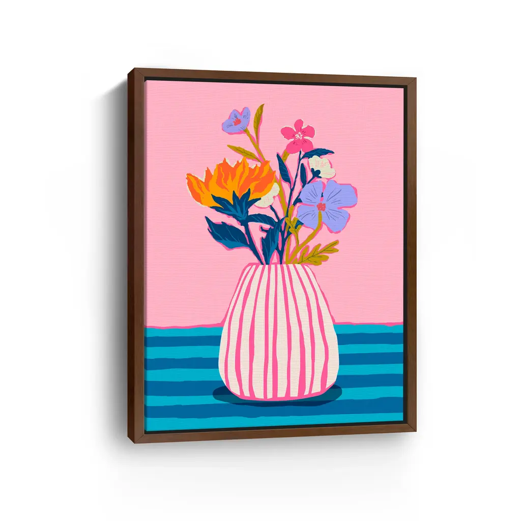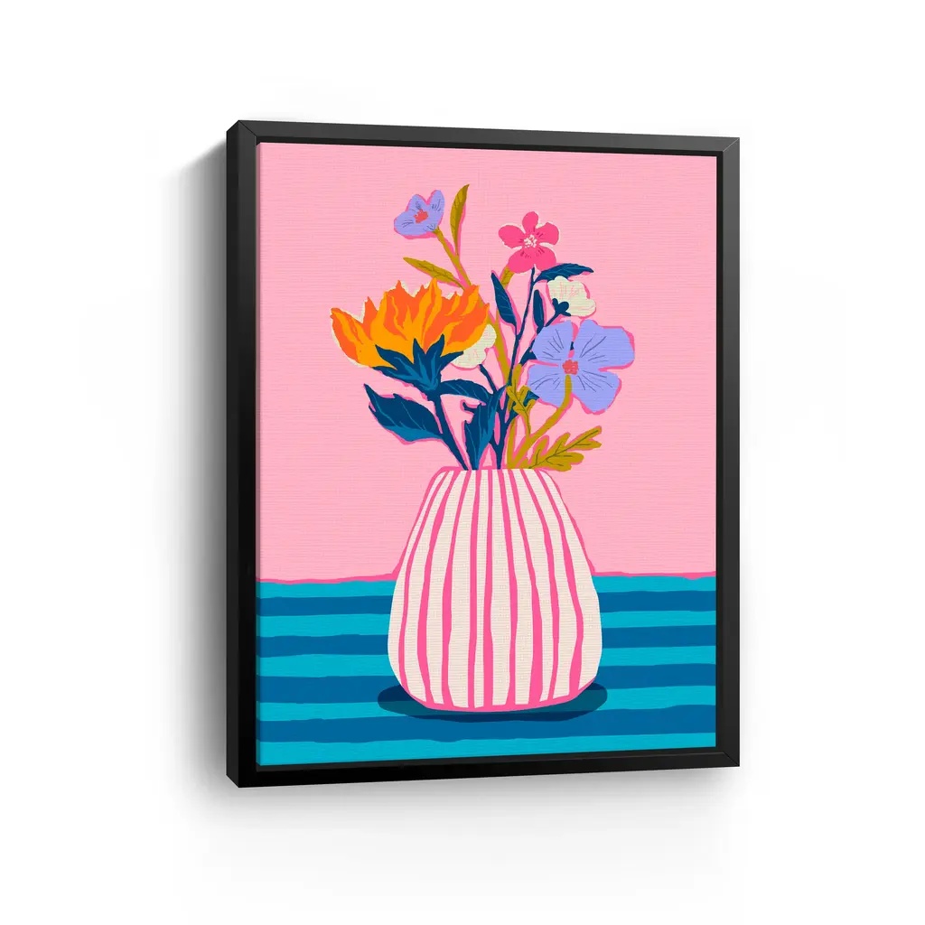 This vibrant canvas print showcases a stylized potted plant in bold pinks, oranges, and lavenders, set against a light pink backdrop and grid-patterned surface. Its clean lines and joyful colors bring a fresh, contemporary vibe to any room. Our Gallery Wrap Canvas Prints are proudly assembled with high quality materials in California, USA. Each piece is printed on a thick, archival grade canvas using Giclee technology. It is then hand-stretched by our experienced artisans over solid wood bars, which will not warp over time. The final product is a piece personally crafted for you to confidently display on your wall. Care and Assembly: Ensure that the location of your piece has little to no exposure to heat, sunlight, and moisture. Wipe clean, only if needed. Each piece includes hanging hardware to hang on your wall vertically.
