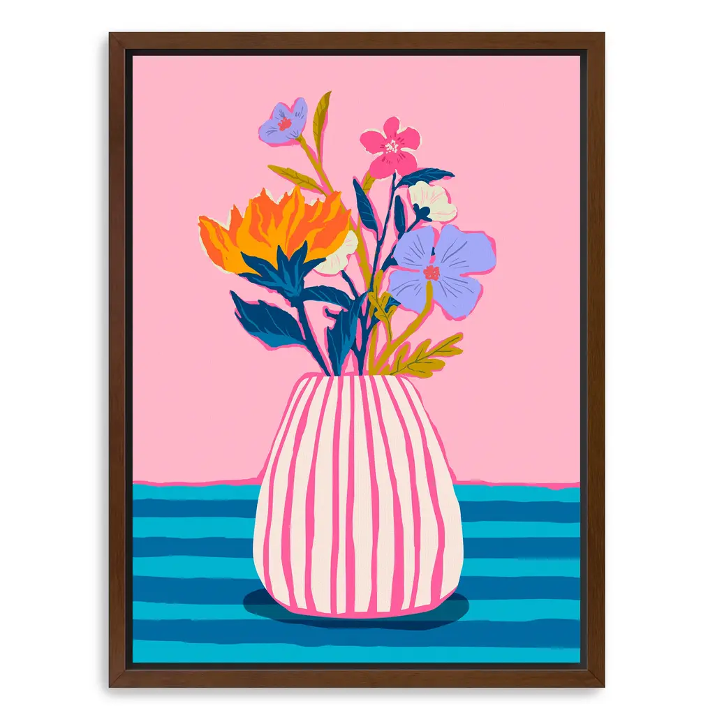 This vibrant canvas print showcases a stylized potted plant in bold pinks, oranges, and lavenders, set against a light pink backdrop and grid-patterned surface. Its clean lines and joyful colors bring a fresh, contemporary vibe to any room. Our Gallery Wrap Canvas Prints are proudly assembled with high quality materials in California, USA. Each piece is printed on a thick, archival grade canvas using Giclee technology. It is then hand-stretched by our experienced artisans over solid wood bars, which will not warp over time. The final product is a piece personally crafted for you to confidently display on your wall. Care and Assembly: Ensure that the location of your piece has little to no exposure to heat, sunlight, and moisture. Wipe clean, only if needed. Each piece includes hanging hardware to hang on your wall vertically.