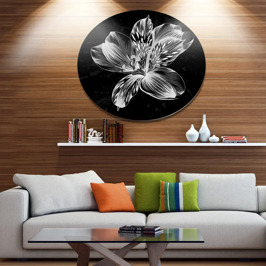 Bring Contemporary Abstraction to your home with this large Circle Metal wall art. This Beautiful Monochrome Alstroemeria Flower Metal Artwork makes it the focal point of any room or office. - White Gloss Coating ensures colors are extra vibrant with light reflection.- Aluminum grade Sheet Metal with 1 inch mounting frame on the back giving the illusion that the artwork is floating on the wall..- Mounting Brackets are included along with instructions.- High Quality Digital images are created directly into a glossy aluminum panel producing a stunning and captivating print into the glossy finish of the metal.- Water, Fire and Scratch resistant HD Aluminum panels.- Looks better than any photo paper and guaranteed to last at least 20 years- Easy to clean with a microfiber cloth. Colors are far superior to regular Canvas Art. - Easy to Hang