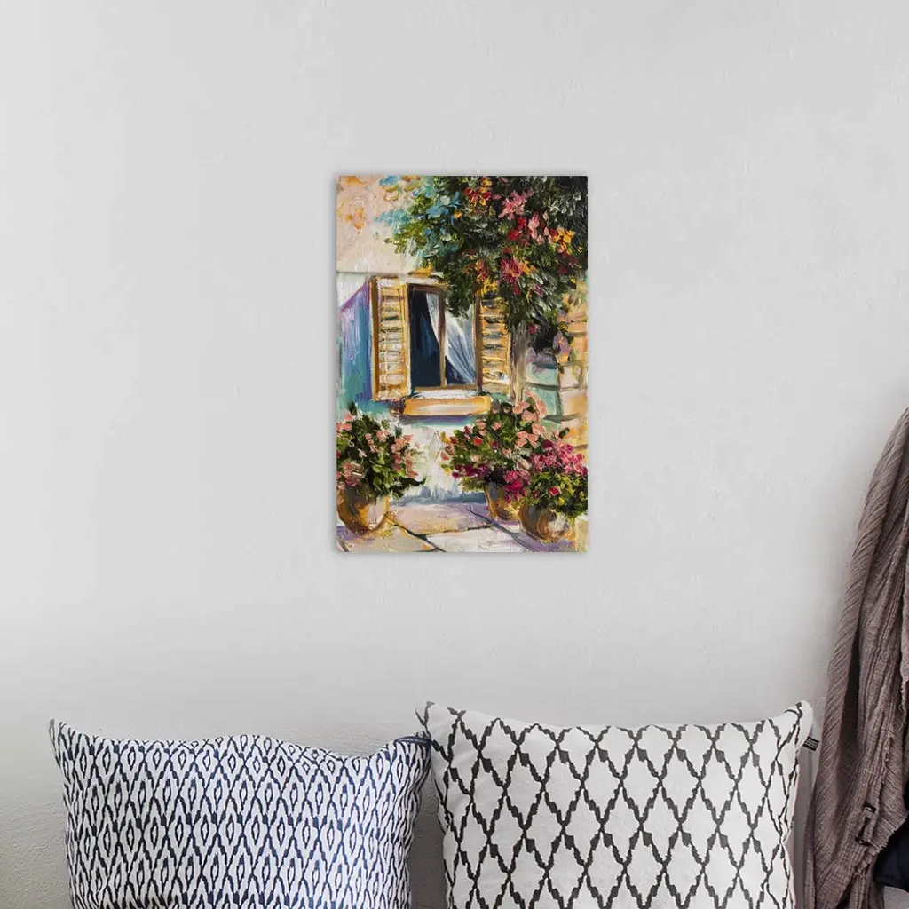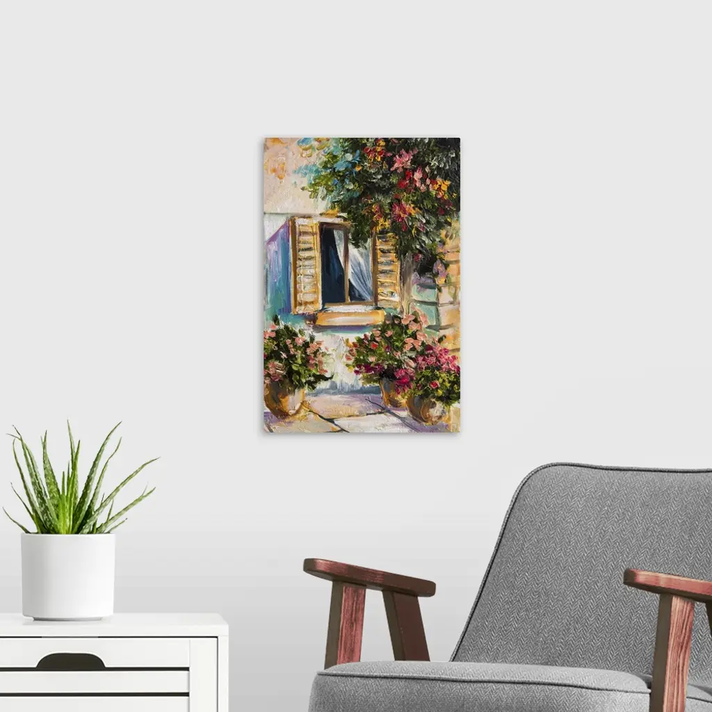 Originally an oil painting of beautiful nature, colorful flowers, street.