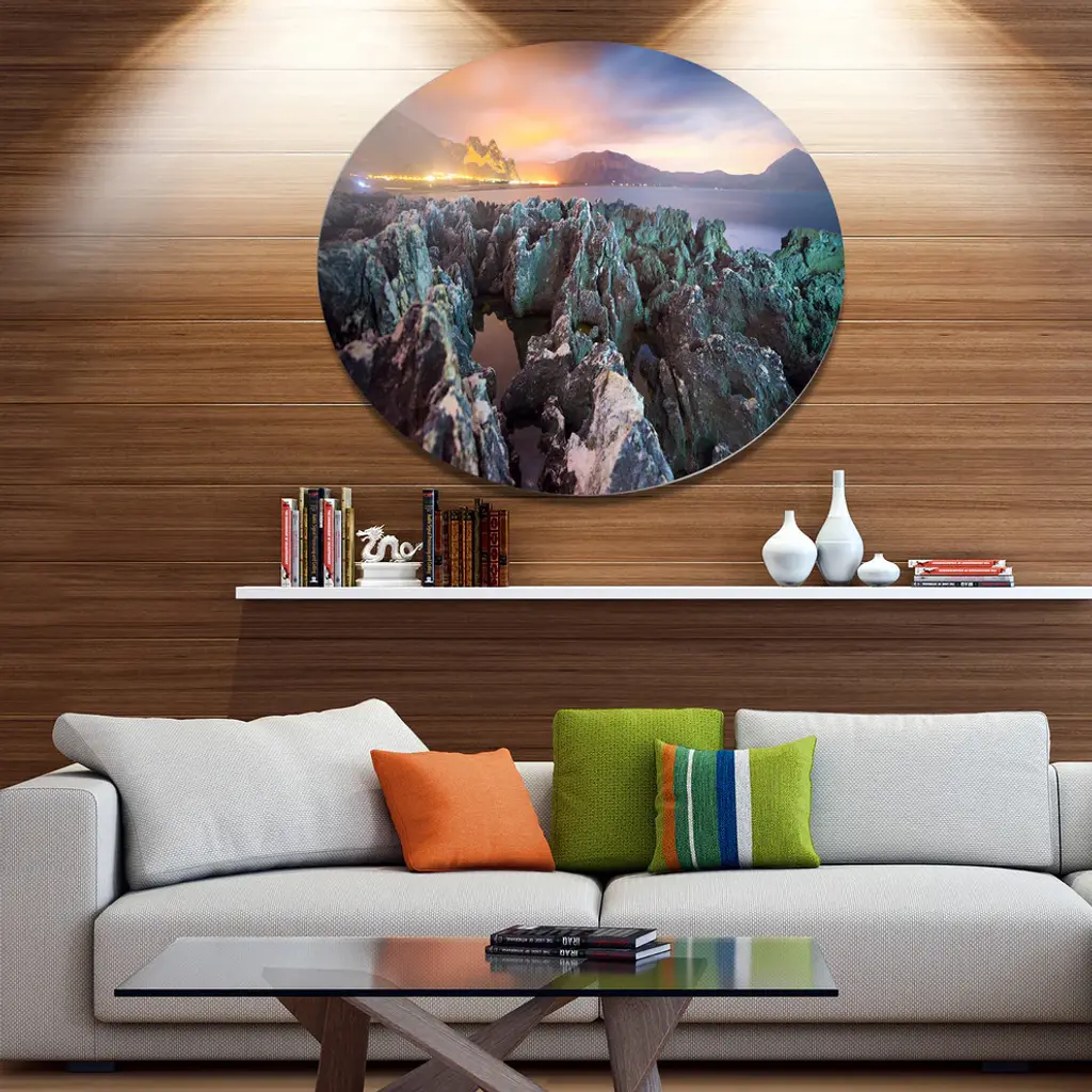 Bring Contemporary Abstraction to your home with this large Circle Metal wall art. This Beautiful Night View of Coast Metal Artwork makes it the focal point of any room or office. - White Gloss Coating ensures colors are extra vibrant with light reflection.- Aluminum grade Sheet Metal with 1 inch mounting frame on the back giving the illusion that the artwork is floating on the wall..- Mounting Brackets are included along with instructions.- High Quality Digital images are created directly into a glossy aluminum panel producing a stunning and captivating print into the glossy finish of the metal.- Water, Fire and Scratch resistant HD Aluminum panels.- Looks better than any photo paper and guaranteed to last at least 20 years- Easy to clean with a microfiber cloth. Colors are far superior to regular Canvas Art. - Easy to Hang