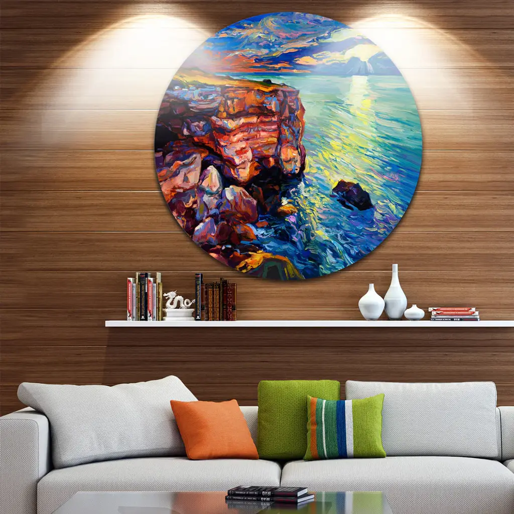 Beautiful Ocean And Cliffs, Seascape Painting Disc Metal Wall Art, 38"