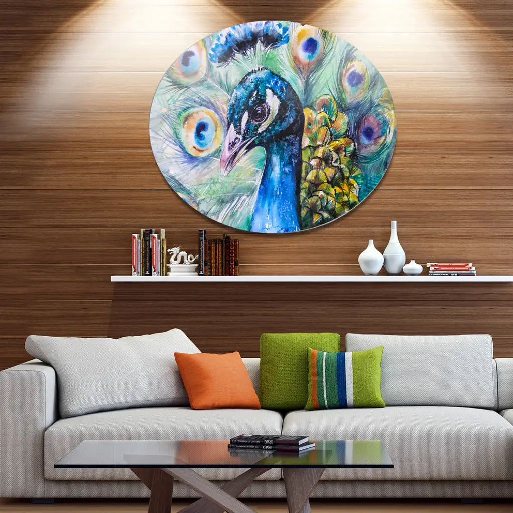 Bring Contemporary Abstraction to your home with this large Circle Metal wall art. This Beautiful Peacock Watercolor Metal Artwork makes it the focal point of any room or office. - White Gloss Coating ensures colors are extra vibrant with light reflection.- Aluminum grade Sheet Metal with 1 inch mounting frame on the back giving the illusion that the artwork is floating on the wall..- Mounting Brackets are included along with instructions.- High Quality Digital images are created directly into a glossy aluminum panel producing a stunning and captivating print into the glossy finish of the metal.- Water, Fire and Scratch resistant HD Aluminum panels.- Looks better than any photo paper and guaranteed to last at least 20 years- Easy to clean with a microfiber cloth. Colors are far superior to regular Canvas Art. - Easy to Hang