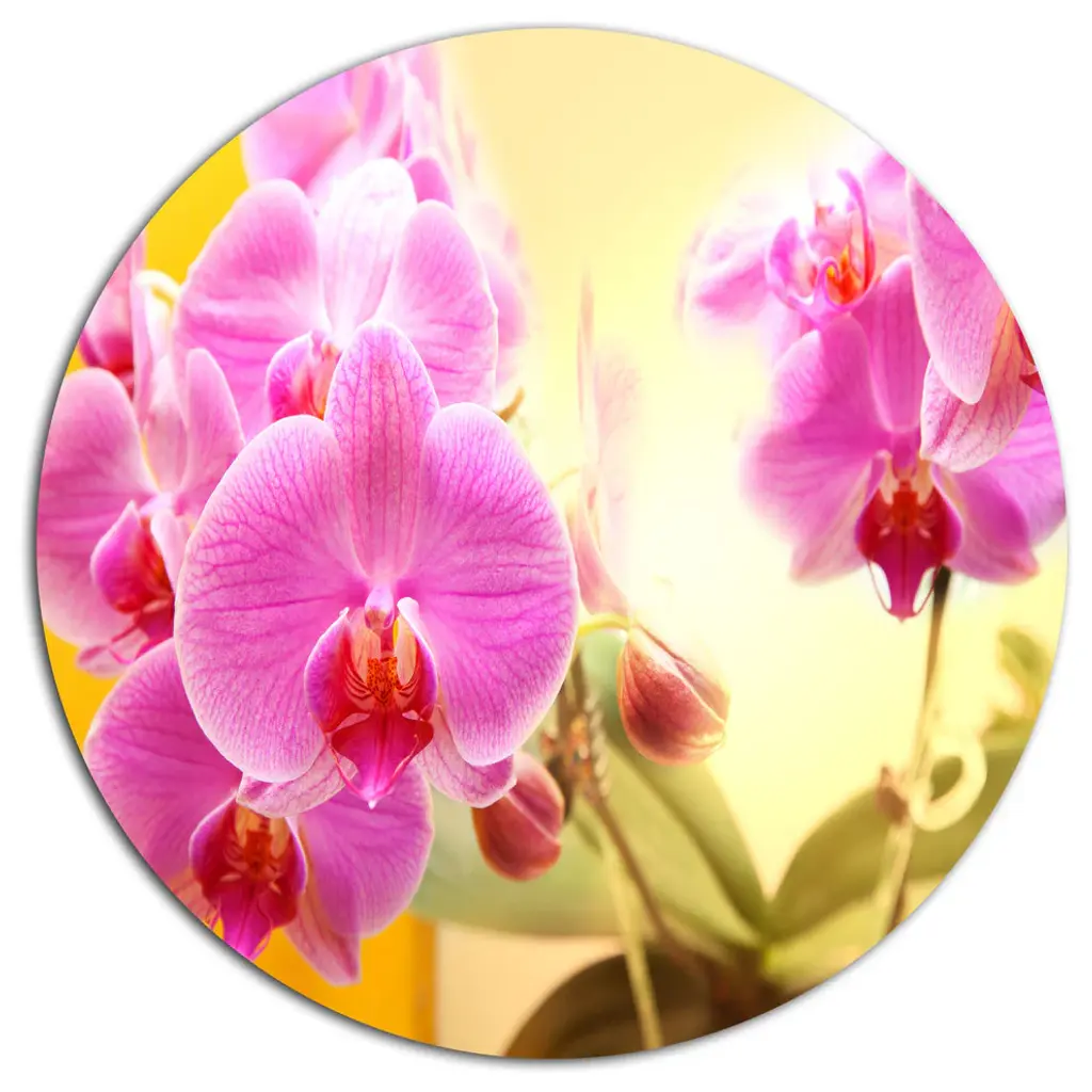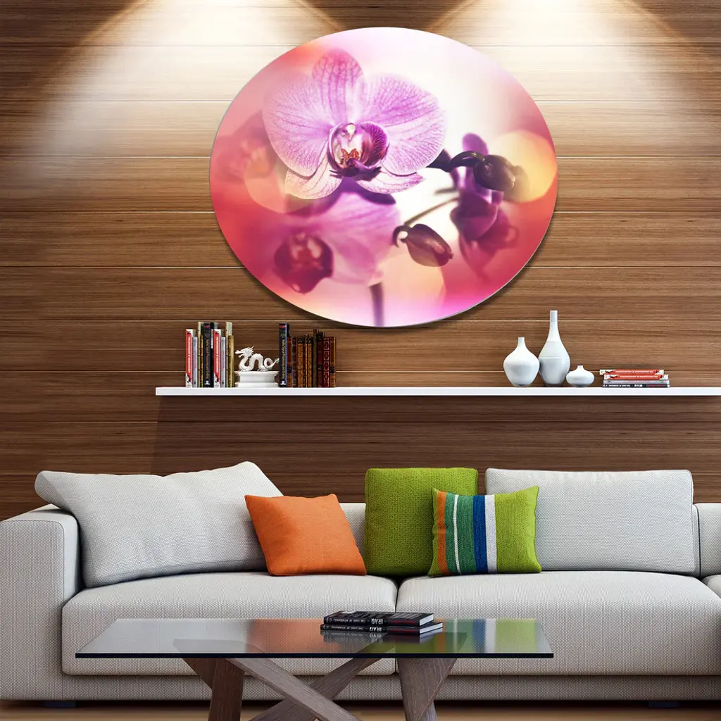 Bring Contemporary Abstraction to your home with this large Circle Metal wall art. This Beautiful Pink Orchid Flowers Metal Artwork makes it the focal point of any room or office. - White Gloss Coating ensures colors are extra vibrant with light reflection.- Aluminum grade Sheet Metal with 1 inch mounting frame on the back giving the illusion that the artwork is floating on the wall..- Mounting Brackets are included along with instructions.- High Quality Digital images are created directly into a glossy aluminum panel producing a stunning and captivating print into the glossy finish of the metal.- Water, Fire and Scratch resistant HD Aluminum panels.- Looks better than any photo paper and guaranteed to last at least 20 years- Easy to clean with a microfiber cloth. Colors are far superior to regular Canvas Art. - Easy to Hang