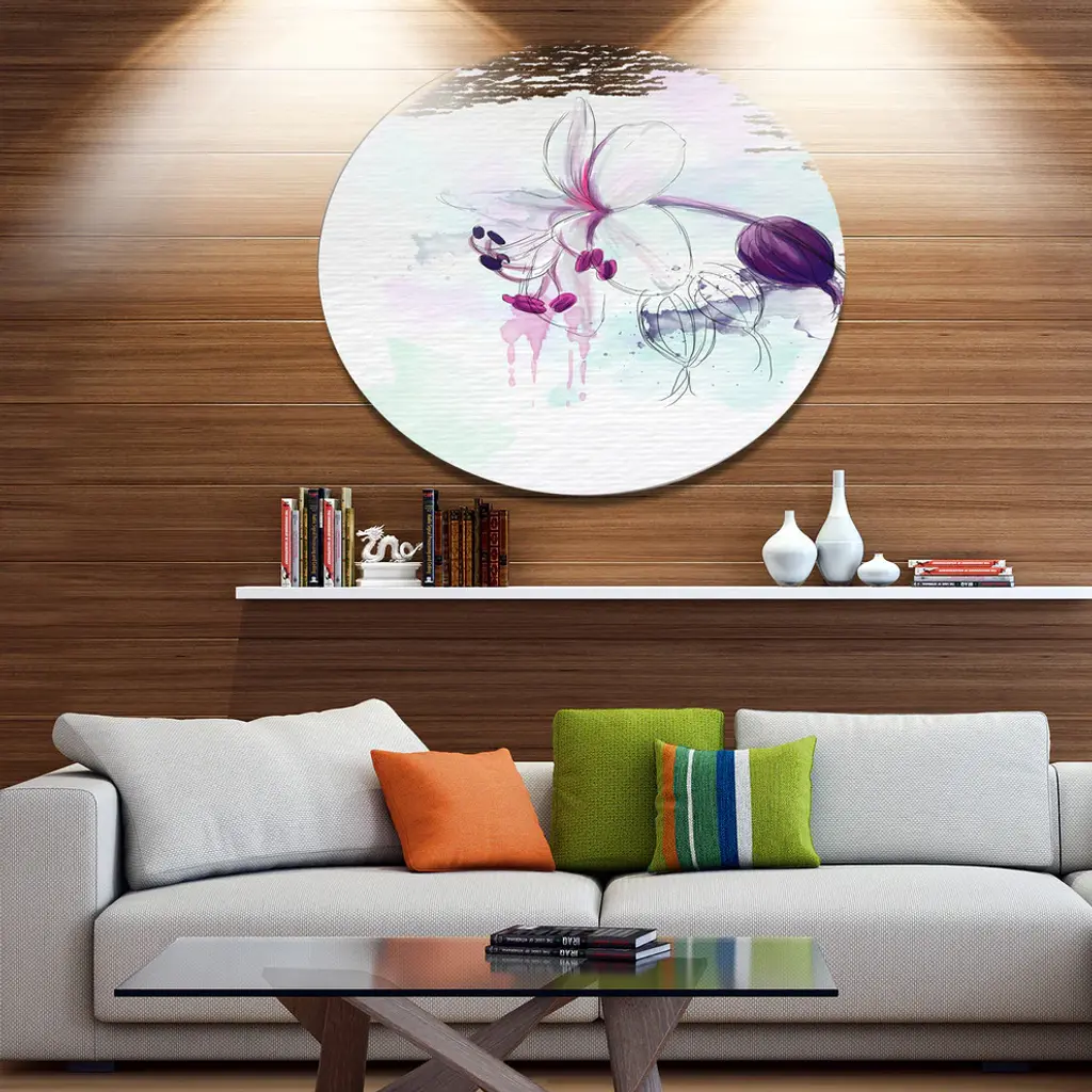 Bring Contemporary Abstraction to your home with this large Circle Metal wall art. This Beautiful Purple Flower with Splashes Metal Artwork makes it the focal point of any room or office. - White Gloss Coating ensures colors are extra vibrant with light reflection.- Aluminum grade Sheet Metal with 1 inch mounting frame on the back giving the illusion that the artwork is floating on the wall..- Mounting Brackets are included along with instructions.- High Quality Digital images are created directly into a glossy aluminum panel producing a stunning and captivating print into the glossy finish of the metal.- Water, Fire and Scratch resistant HD Aluminum panels.- Looks better than any photo paper and guaranteed to last at least 20 years- Easy to clean with a microfiber cloth. Colors are far superior to regular Canvas Art. - Easy to Hang