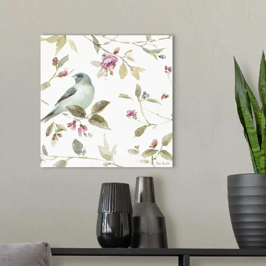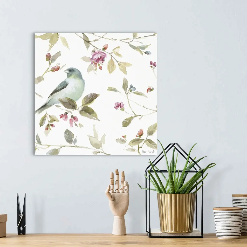 Square watercolor painting with a blue songbird surrounded by leaves and pink buds and flowers.