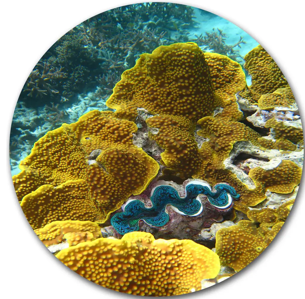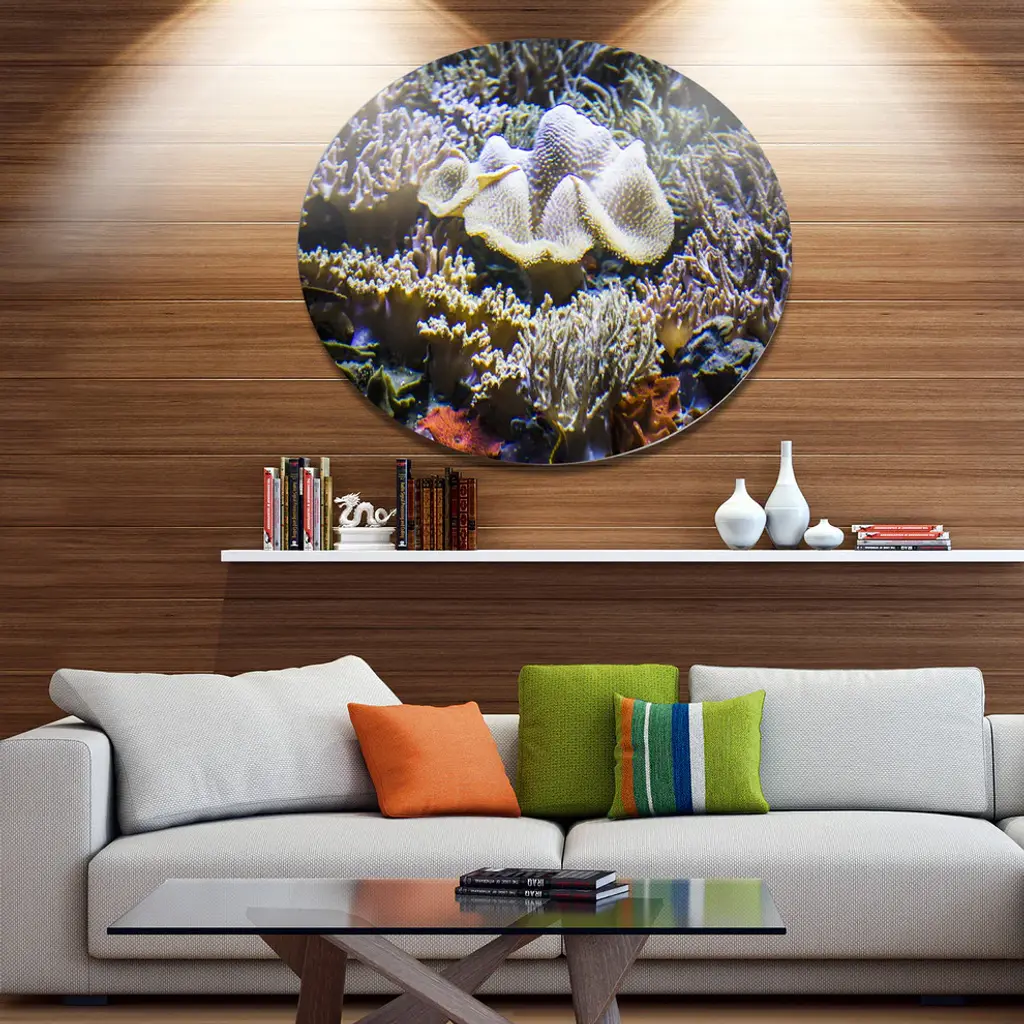 Bring Contemporary Abstraction to your home with this large Circle Metal wall art. This Beautiful Seabed With Fish Metal Artwork makes it the focal point of any room or office. - White Gloss Coating ensures colors are extra vibrant with light reflection.- Aluminum grade Sheet Metal with 1 inch mounting frame on the back giving the illusion that the artwork is floating on the wall..- Mounting Brackets are included along with instructions.- High Quality Digital images are created directly into a glossy aluminum panel producing a stunning and captivating print into the glossy finish of the metal.- Water, Fire and Scratch resistant HD Aluminum panels.- Looks better than any photo paper and guaranteed to last at least 20 years- Easy to clean with a microfiber cloth. Colors are far superior to regular Canvas Art. - Easy to Hang