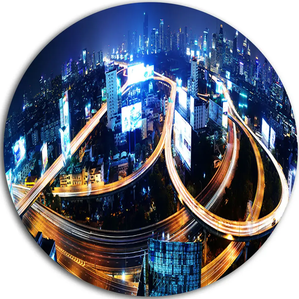 Bring Contemporary Abstraction to your home with this large Circle Metal wall art. This Beautiful Shanghai Traffic Metal Artwork makes it the focal point of any room or office. - White Gloss Coating ensures colors are extra vibrant with light reflection.- Aluminum grade Sheet Metal with 1 inch mounting frame on the back giving the illusion that the artwork is floating on the wall..- Mounting Brackets are included along with instructions.- High Quality Digital images are created directly into a glossy aluminum panel producing a stunning and captivating print into the glossy finish of the metal.- Water, Fire and Scratch resistant HD Aluminum panels.- Looks better than any photo paper and guaranteed to last at least 20 years- Easy to clean with a microfiber cloth. Colors are far superior to regular Canvas Art. - Easy to Hang